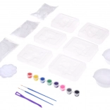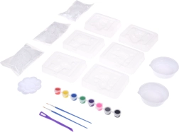 - 3 vrečke mavca, prozorni kalupi za ptice, 2 merici, paleta za mešanje, 8 akrilnih barv, 2 čopiča, plastično orodje/nožek