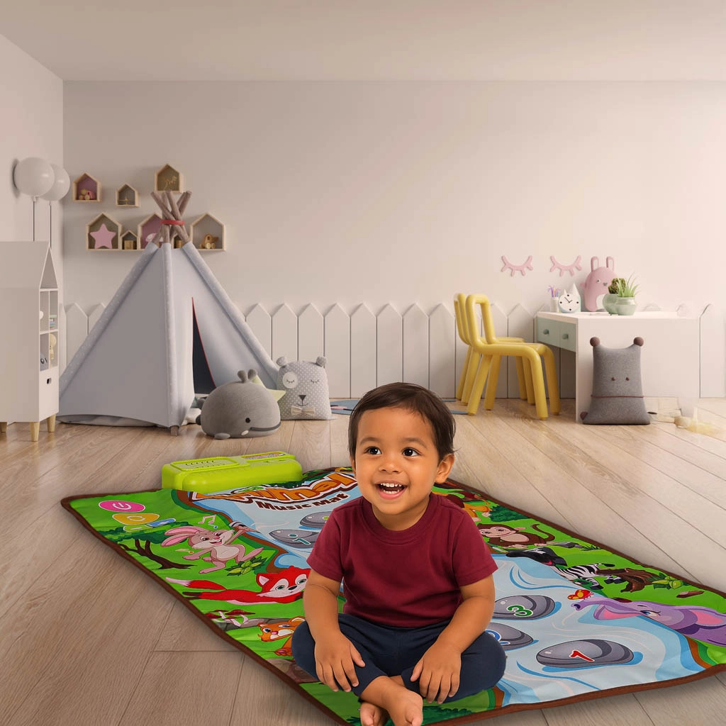 Odkrijte zabavno in varno interaktivno glasbeno podlogo z živalmi, ki združuje učenje, gibanje in glasbo v enem. Podloga se odziva na dotik, predvaja melodije, zvoke živali in pomaga razvijati sluh, ritem, koordinacijo ter kreativnost otrok od 18 mesecev naprej.