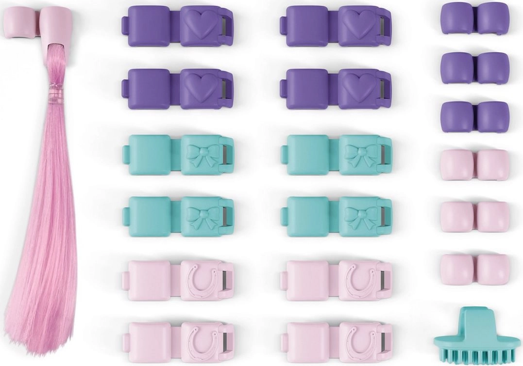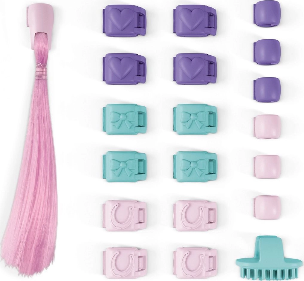 Ustvari čudovite pričeske za svoje konje s kompletom dodatkov SCHLEICH HORSE CLUB. Pastelni odtenki – mint, sivka in svetlo rožnata – se podajo k kobilam in žrebcem vseh pasem. Pred pripenjanjem dodatkov je dovolj, da grivo skrbno prečešeš s krtačo, da sponke ostanejo na mestu tudi pri najbolj divjih skokih. Rožnat pramen pričeski doda končni “wow” učinek.