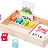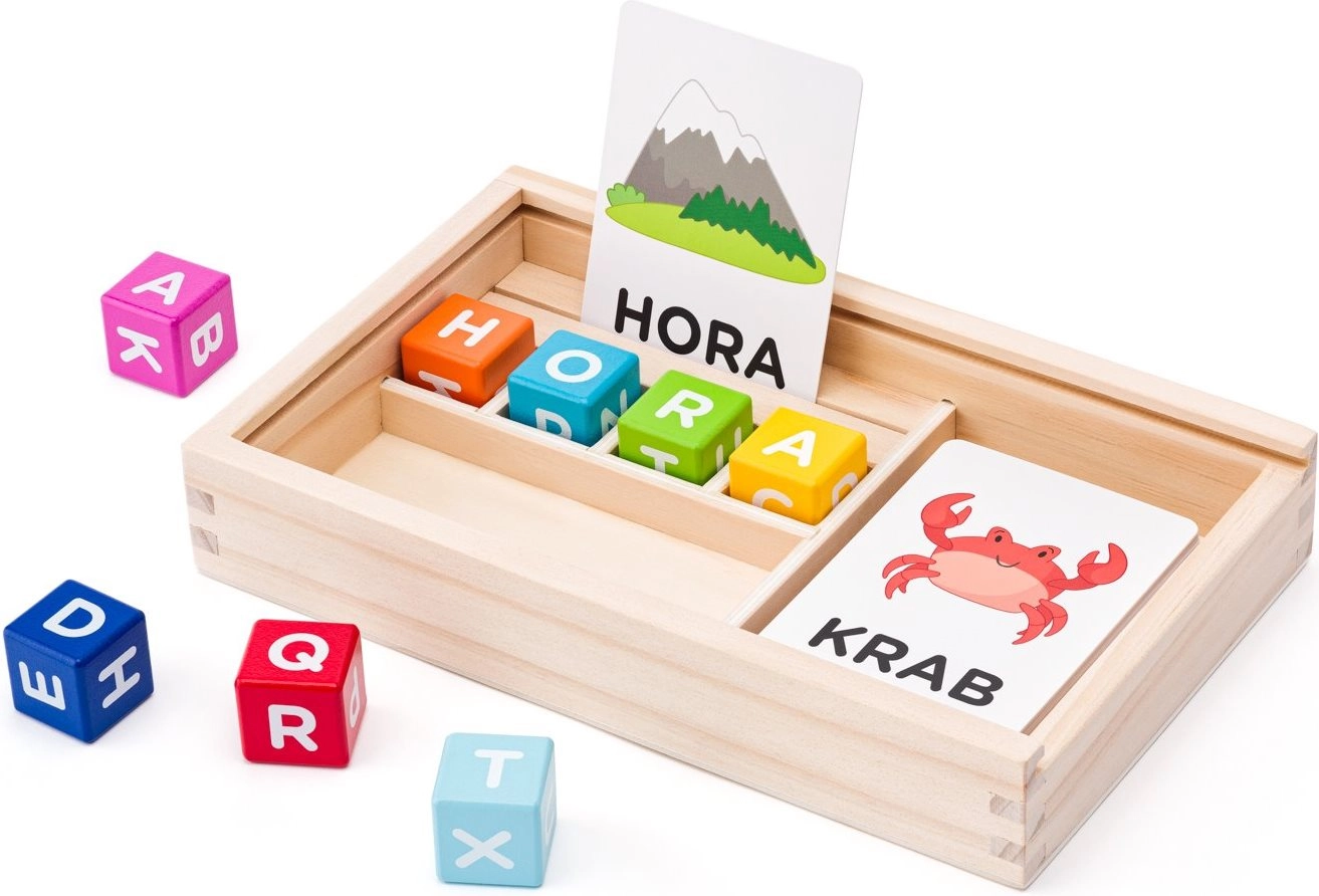 Zabavna izobraževalna igra Woody Sestavi besede podpira prepoznavanje črk, sestavljanje kratkih besed ter razvoj fine motorike in logičnega mišljenja. Otrok vstavi kartico s sliko v stojalo in na barvnih kockah poišče pravilne črke za sestavo imena.