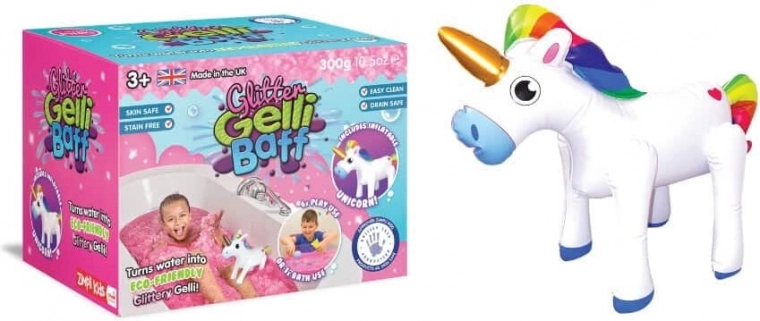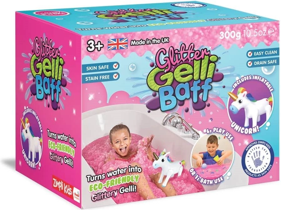 Glitter Gelli Baff prinaša otrokom senzorično zabavo v kadi in zunaj nje. V nekaj minutah se voda spremeni v gosto, rožnato in bleščeče žele, ki je nestrupeno, brez škodljivih kemikalij in dermatološko prijazno. Po koncu igre dodajte priloženo raztopilo in gel se spremeni nazaj v vodo, ki jo je mogoče varno izpustiti.