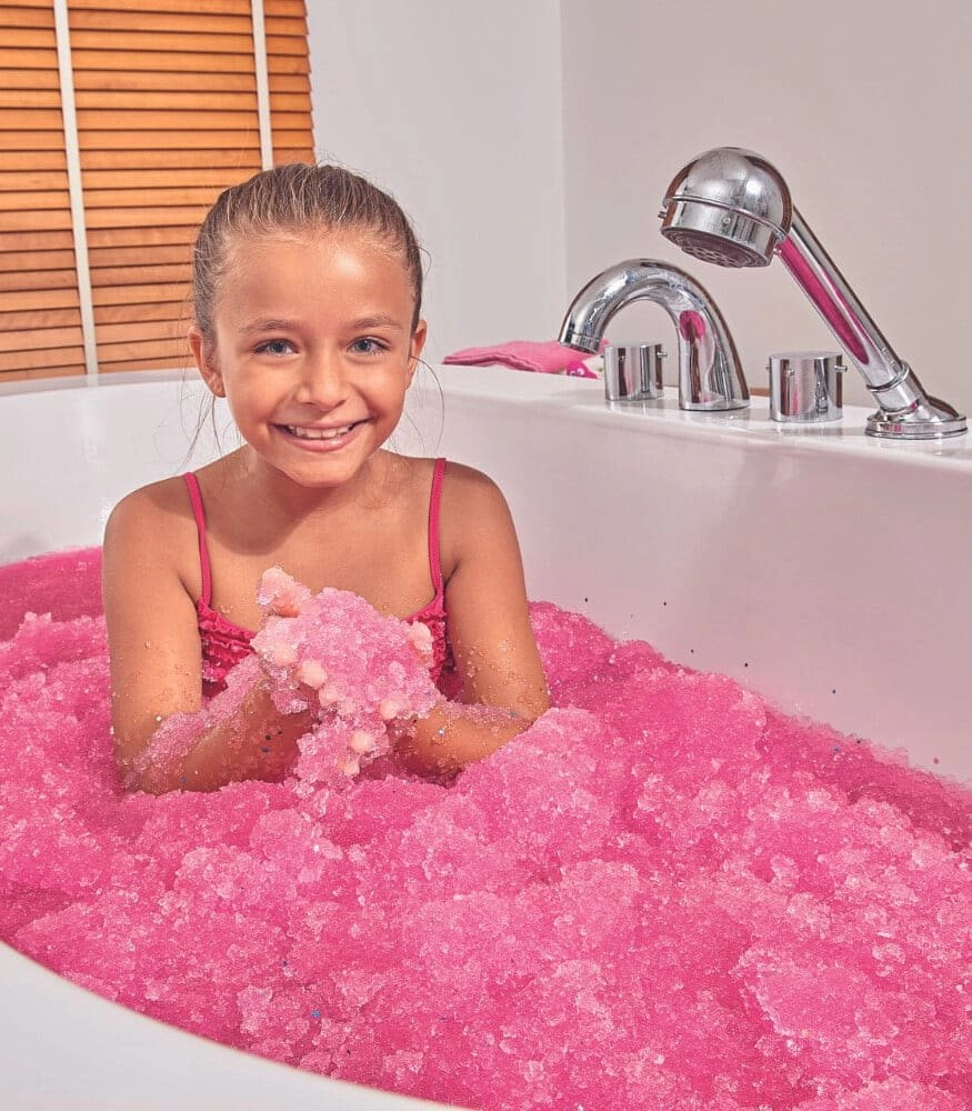 Samo nasujte prašek v kad in v hipu dobite rožnato, bleščeče žele, ki ga otroci obožujejo. Senzorična igra, ki spodbuja ustvarjalnost in fino motoriko.