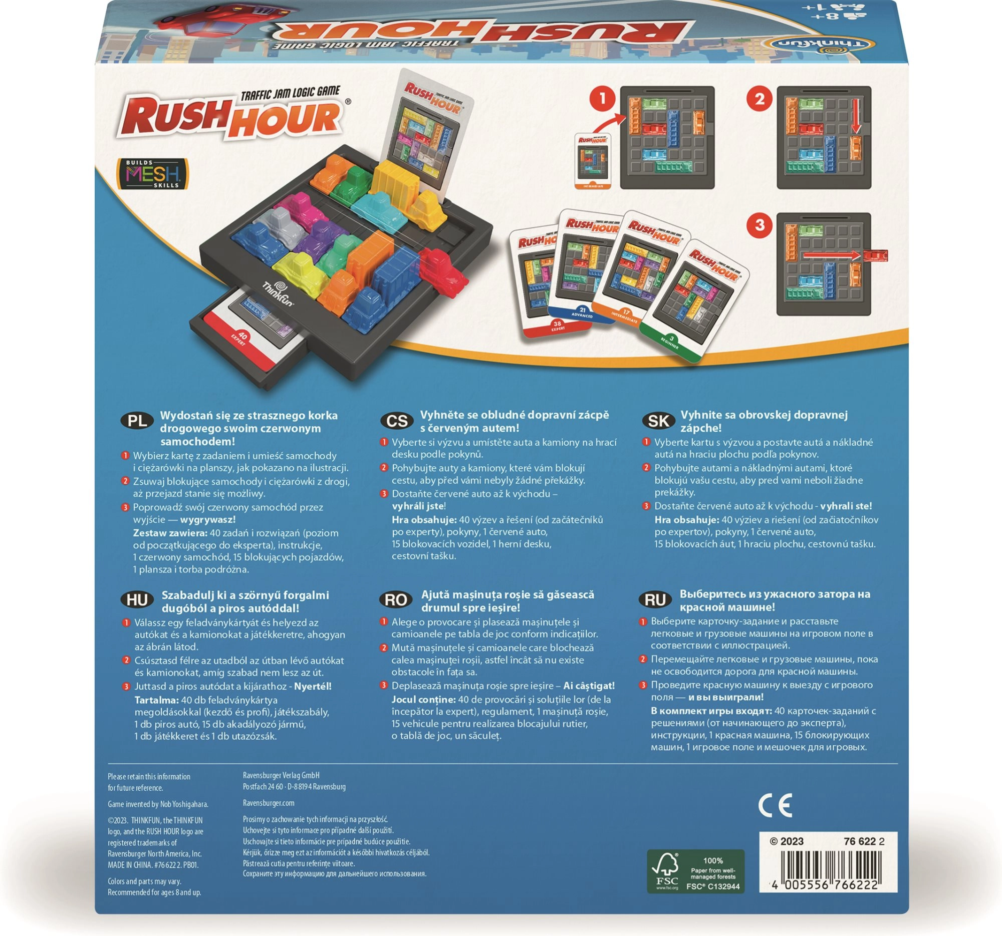 Legendarna logična igra ThinkFun Rush Hour preveri vaše načrtovanje in potrpežljivost. Vaš cilj je odpraviti zastoje in spraviti rdeči avto do izhoda s premikanjem drugih vozil. Odlična možganska vadbena igra za otroke in odrasle, idealna za na pot ali za doma.