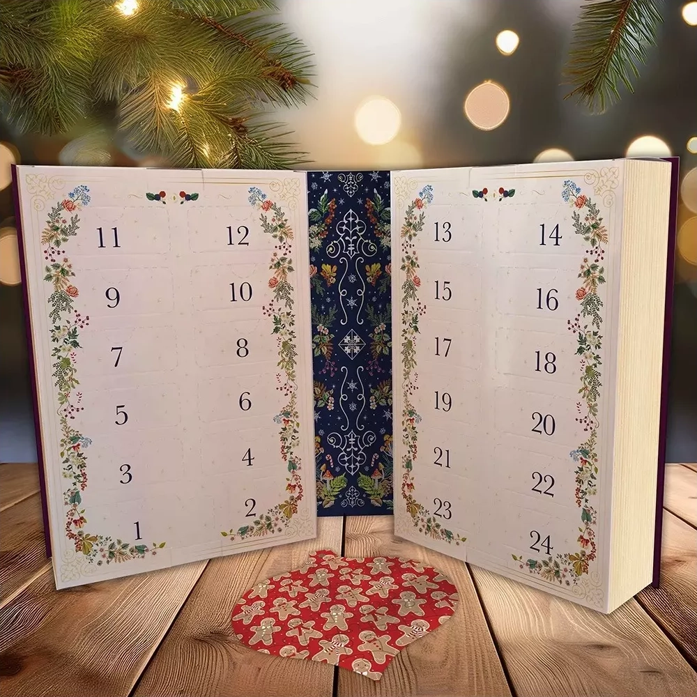 Eleganten »book-style« koledar z bogato božično grafiko in 24 perforiranimi vratci za vsakodnevno presenečenje.