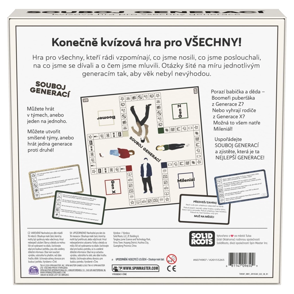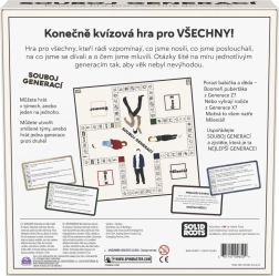 Doživite napet znanstveni dvoboj skozi čas! Ta edinstvena kviz igra za 2 ali več igralcev preizkusi vaše znanje iz zadnjih skoraj sto let. Vprašanja so razdeljena na štiri obdobja – Boomer, generacija X, milenijci, generacija Z – in se osredotočajo na zgodovino, kulturo, oglaševanje, modo in trende. Igra se posamično ali v ekipah, karte Izziv pa preverijo vašo iznajdljivost in sposobnosti. Idealna družinska in zabavna igra za 20–60 minut, od 10 let dalje. Samo za češki trg.