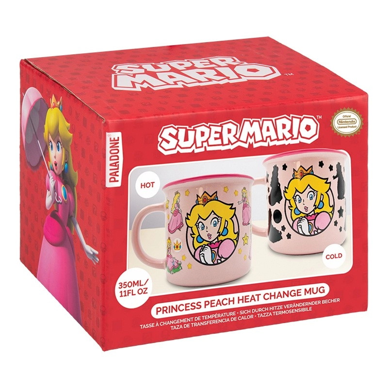 Razveselite se z ikoničnim dodatkom za kuhinjo. Ta na temperaturo občutljiva skodelica s princeso Peach spremeni videz ob stiku z vročo pijačo, zato je vsaka skodelica kave ali čaja malo presenečenje. Zahvaljujoč prostornini 350 ml je idealna za vsakodnevno uporabo doma in v pisarni.