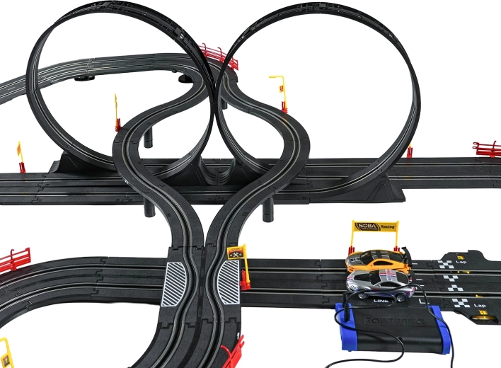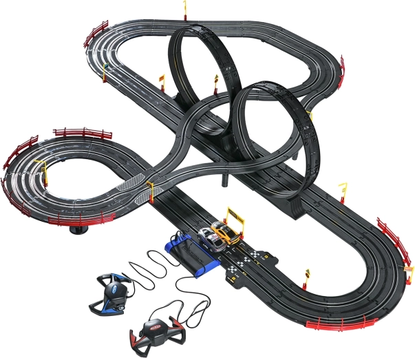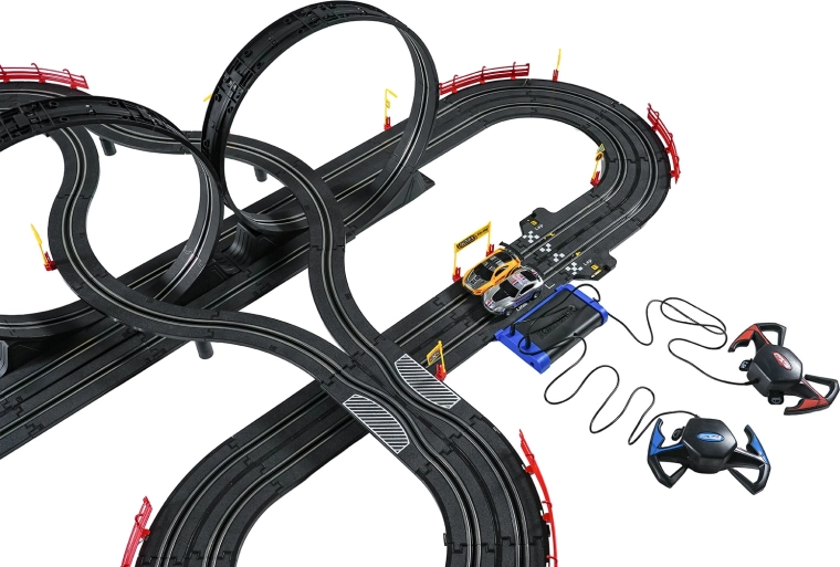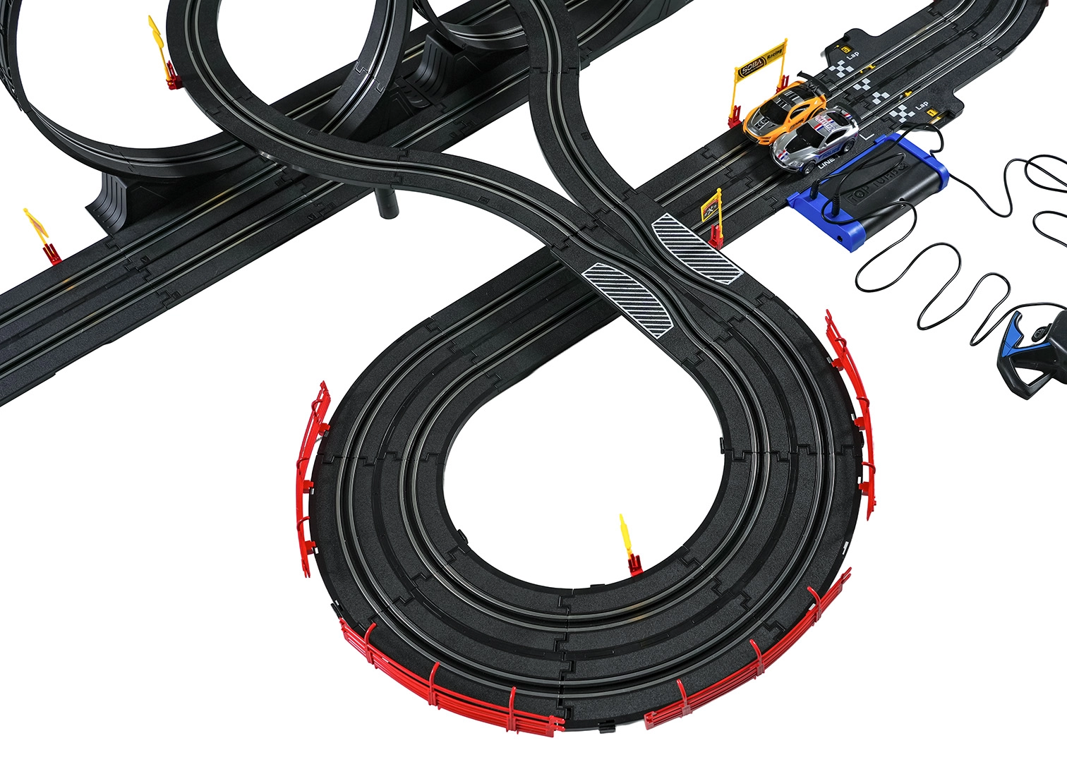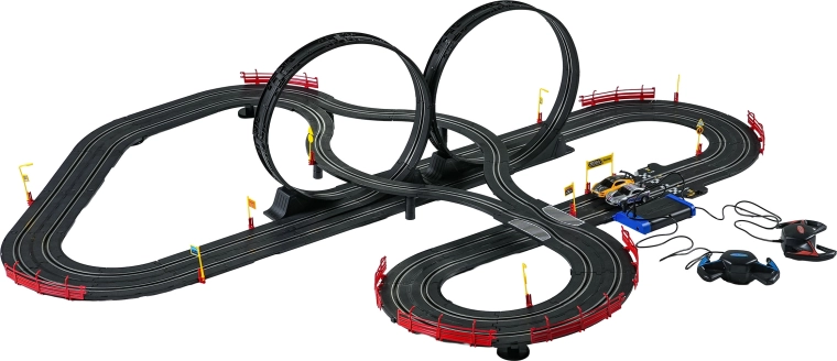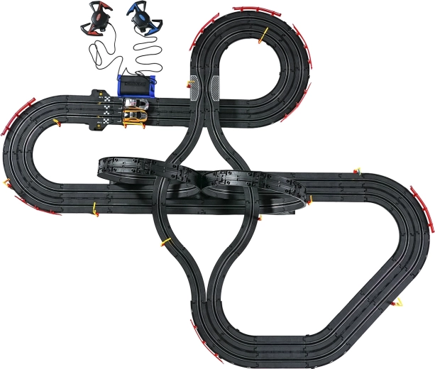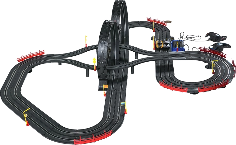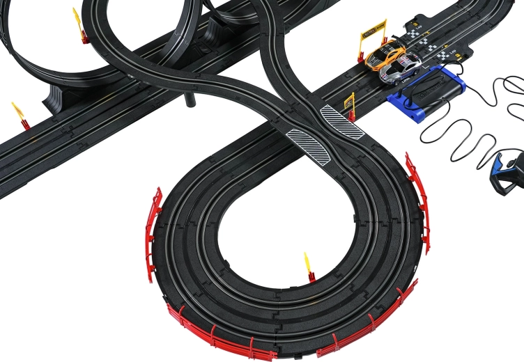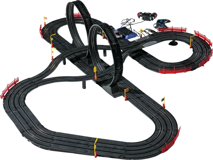 Modularni deli z varnostnimi ograjami omogočajo stabilno vožnjo tudi v najhitrejših delih. Dva upravljalnika lahko priključite na bazo ali napajate z baterijami, zato imate svobodo dirkati po svojih pravilih. Zaradi dolge proge je dovolj prostora za prehitevanja, taktično vožnjo in dramatične finish-e.