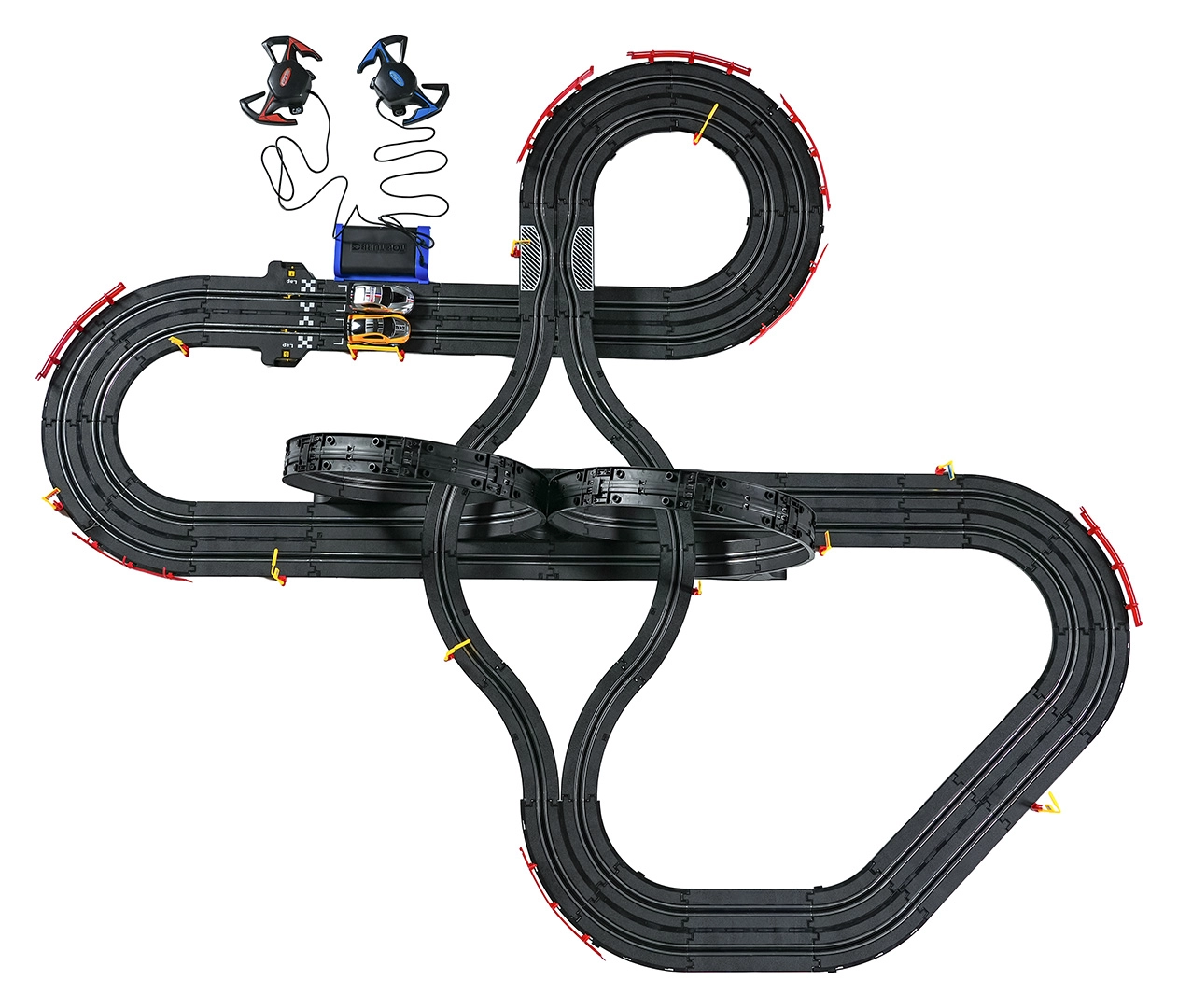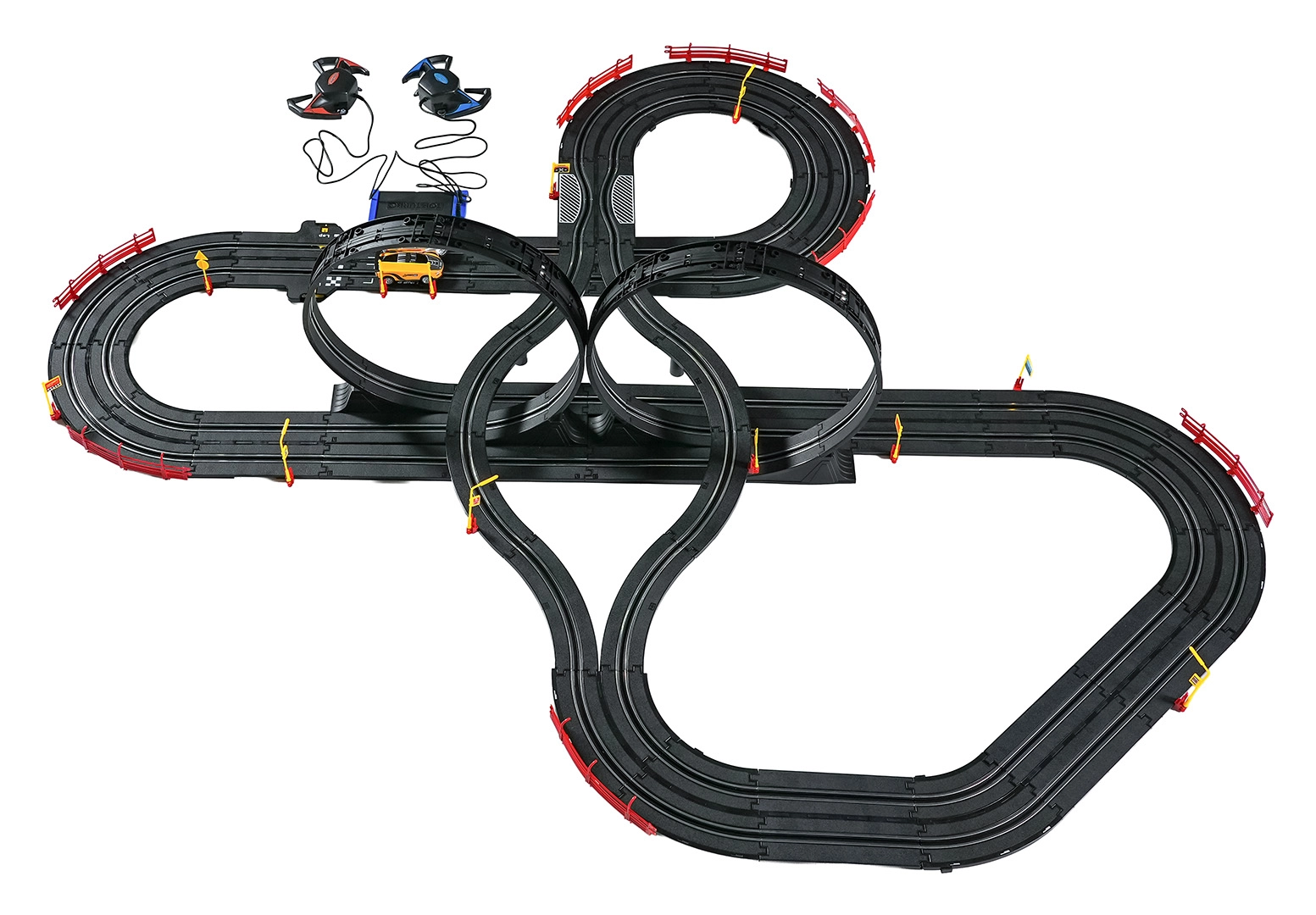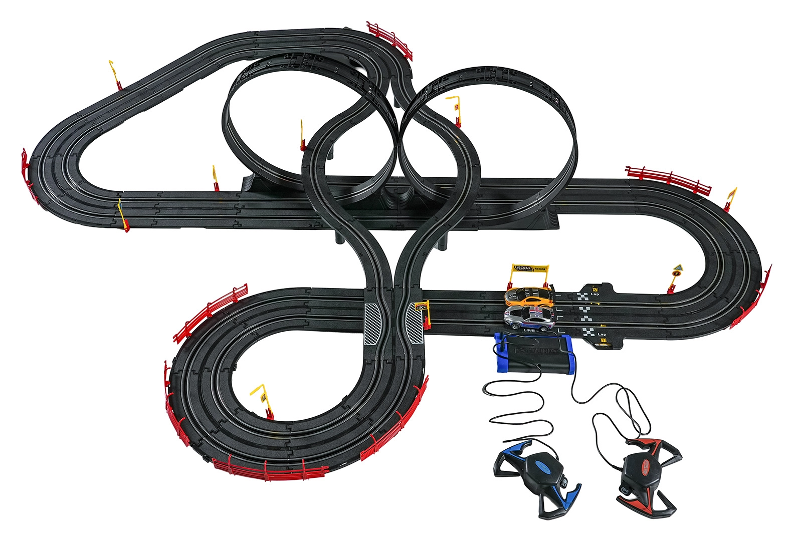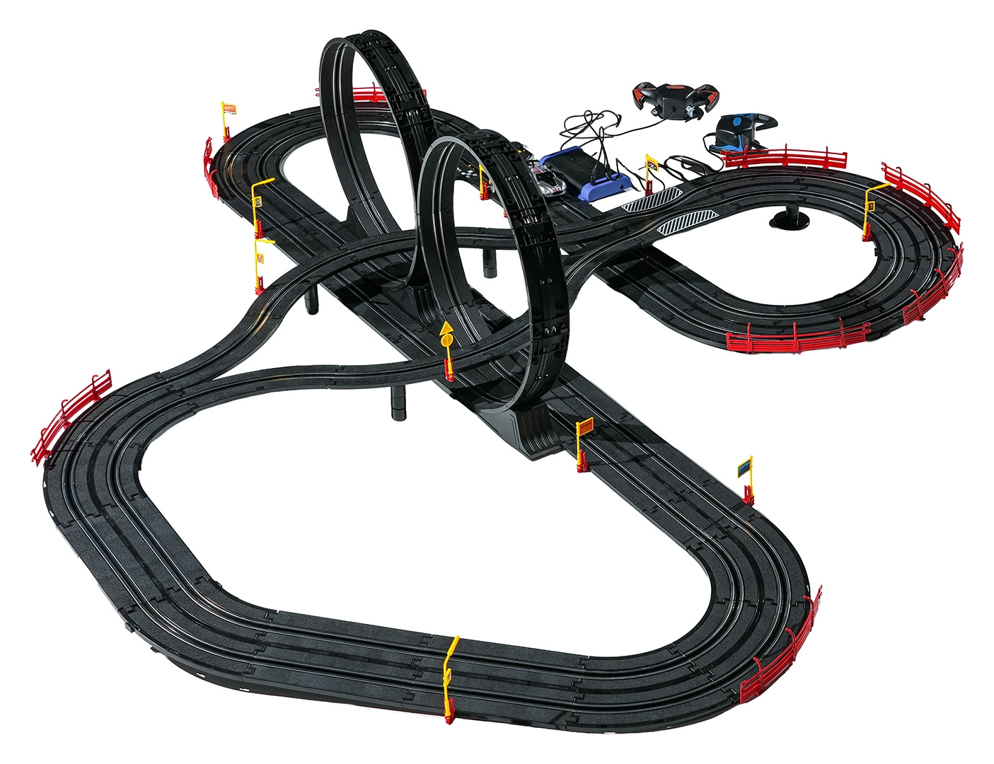 Modularni deli z varnostnimi ograjami omogočajo stabilno vožnjo tudi v najhitrejših delih. Dva upravljalnika lahko priključite na bazo ali napajate z baterijami, zato imate svobodo dirkati po svojih pravilih. Zaradi dolge proge je dovolj prostora za prehitevanja, taktično vožnjo in dramatične finish-e.