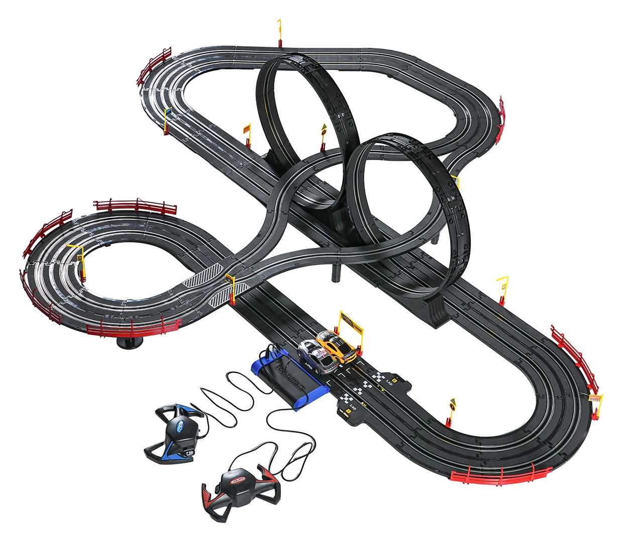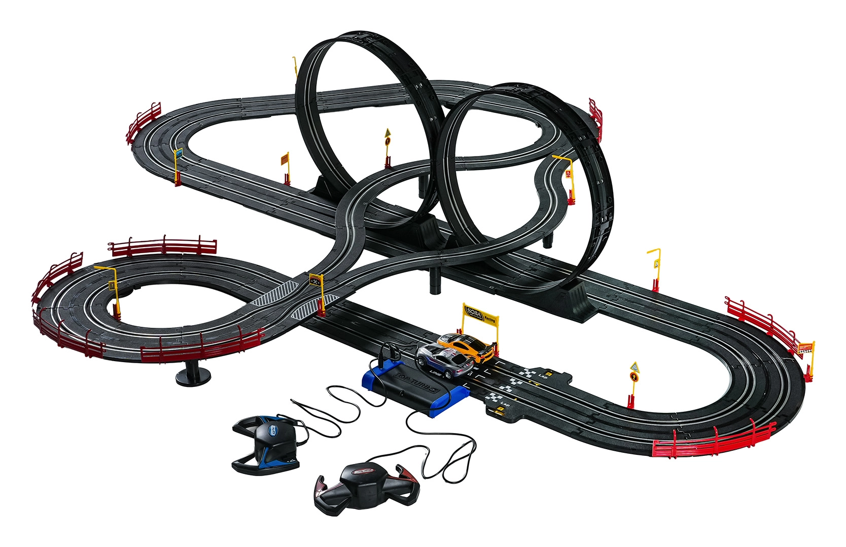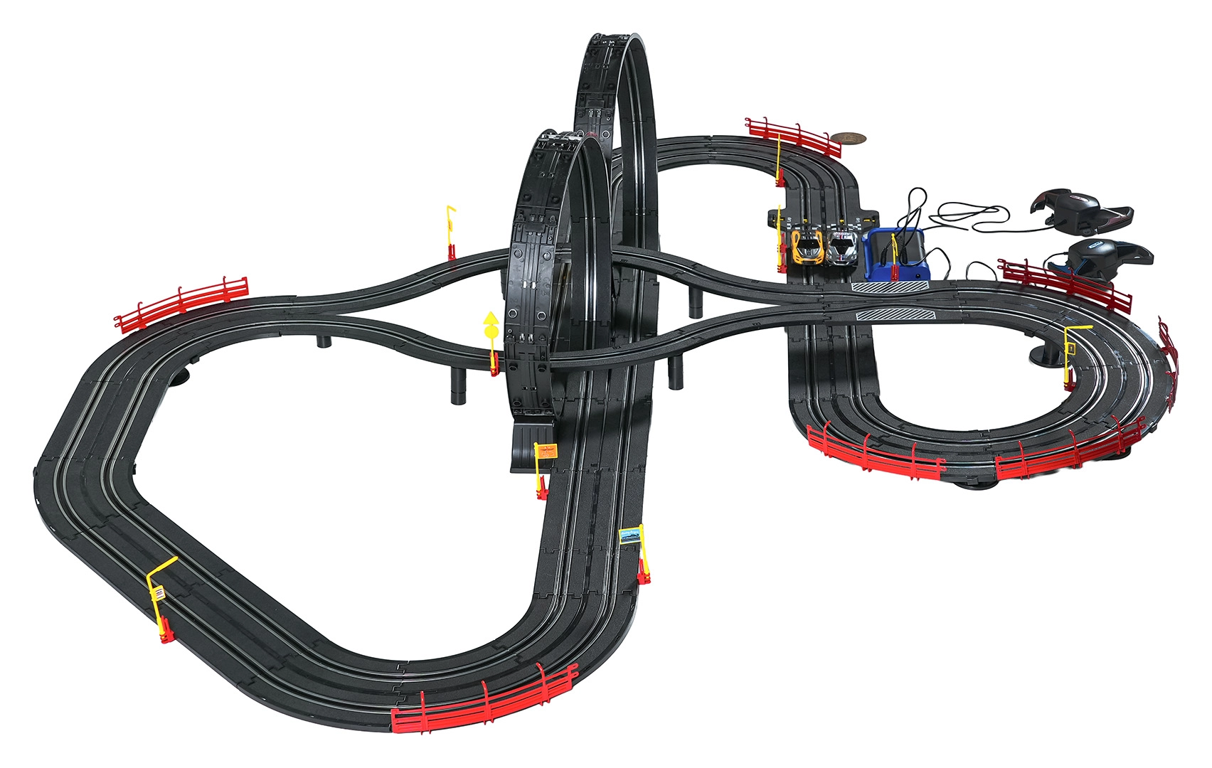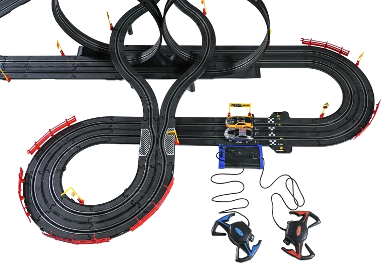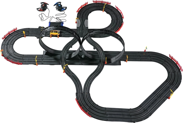 Modularni deli z varnostnimi ograjami omogočajo stabilno vožnjo tudi v najhitrejših delih. Dva upravljalnika lahko priključite na bazo ali napajate z baterijami, zato imate svobodo dirkati po svojih pravilih. Zaradi dolge proge je dovolj prostora za prehitevanja, taktično vožnjo in dramatične finish-e.
