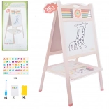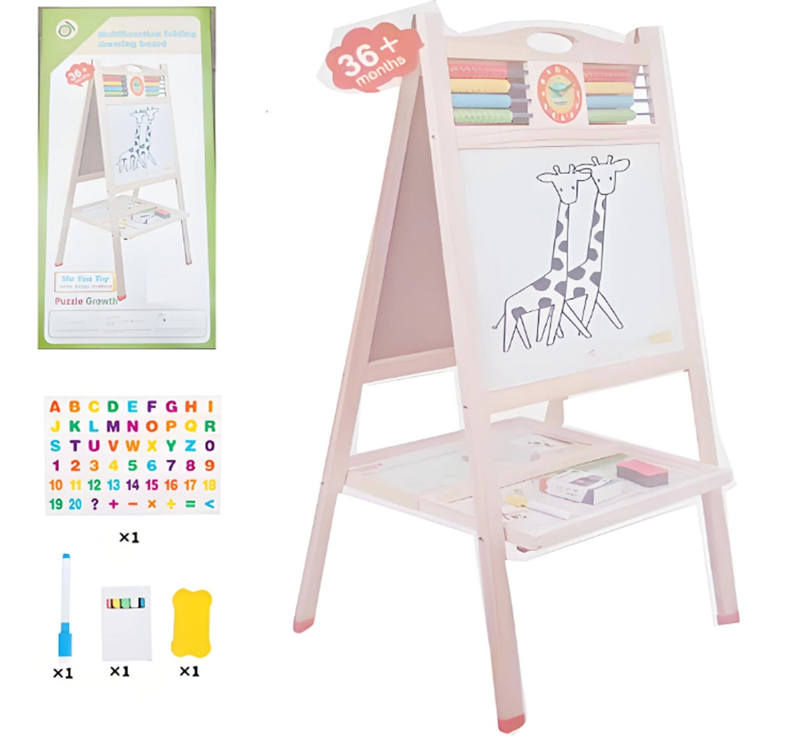 Velika lesena tabla za otroke od 3 let ponuja na eni strani magnetno belo površino za flomaster, na drugi pa kredno tablo. V zgornjem delu sta abak in številčnica z gibljivimi kazalci. Priložena so magnetne črke in številke, flomaster z radirko, krede in gobica – vse za zabavno učenje, razvoj fine motorike, osredotočenosti in domišljije.