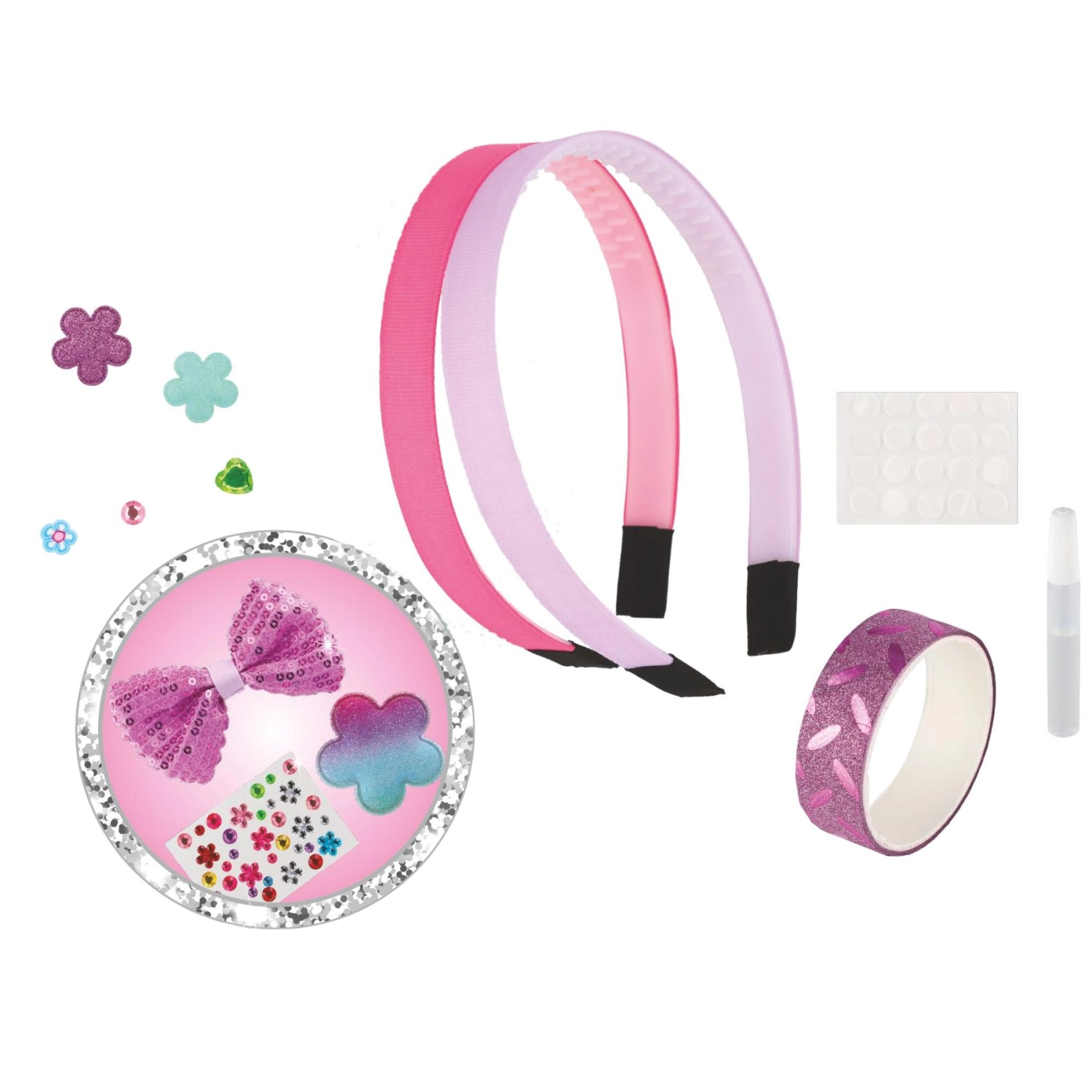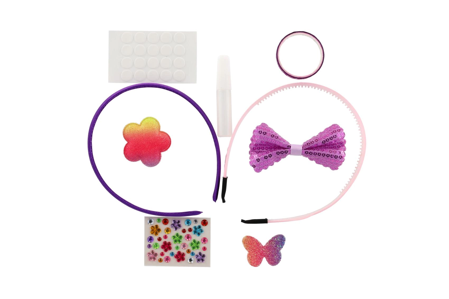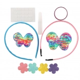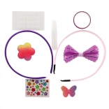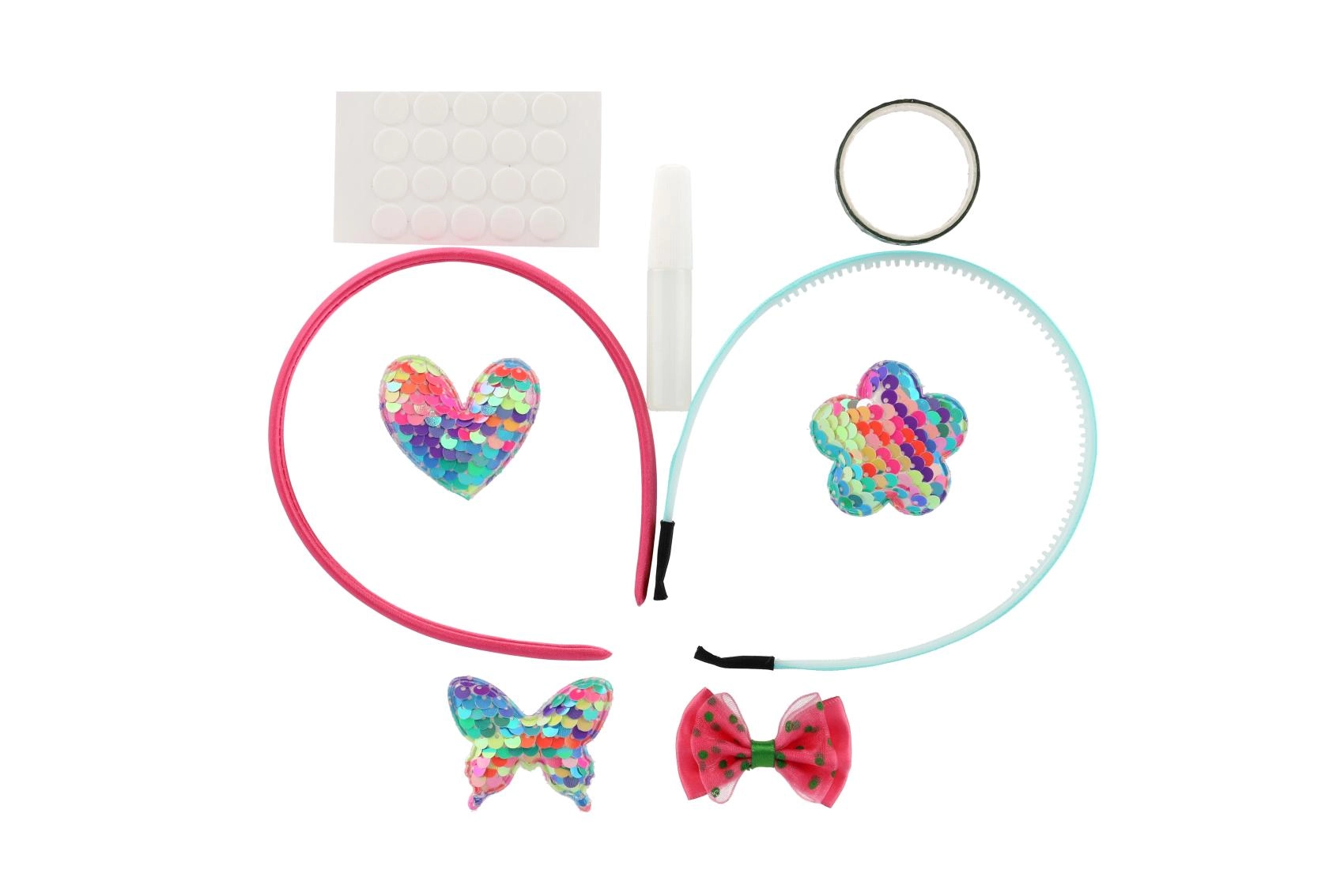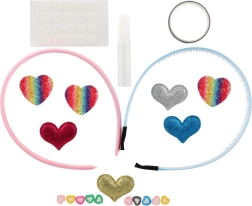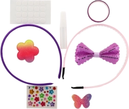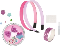 Dva plastična naglavna obroča, samolepilne pikice, majhno lepilo in množica dekoracij – od bleščečih aplikacij do kamenčkov. Dovolj je odpreti in začeti okraševati.