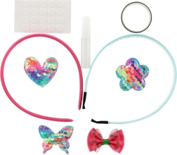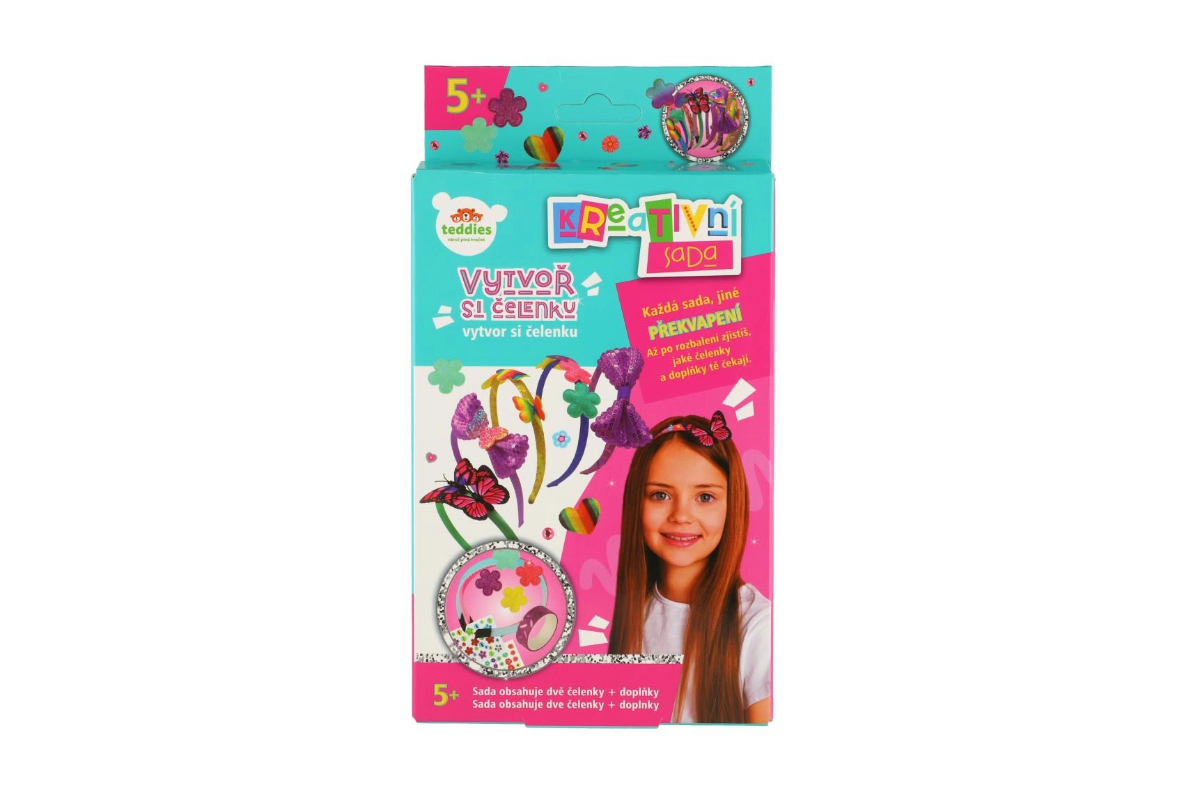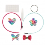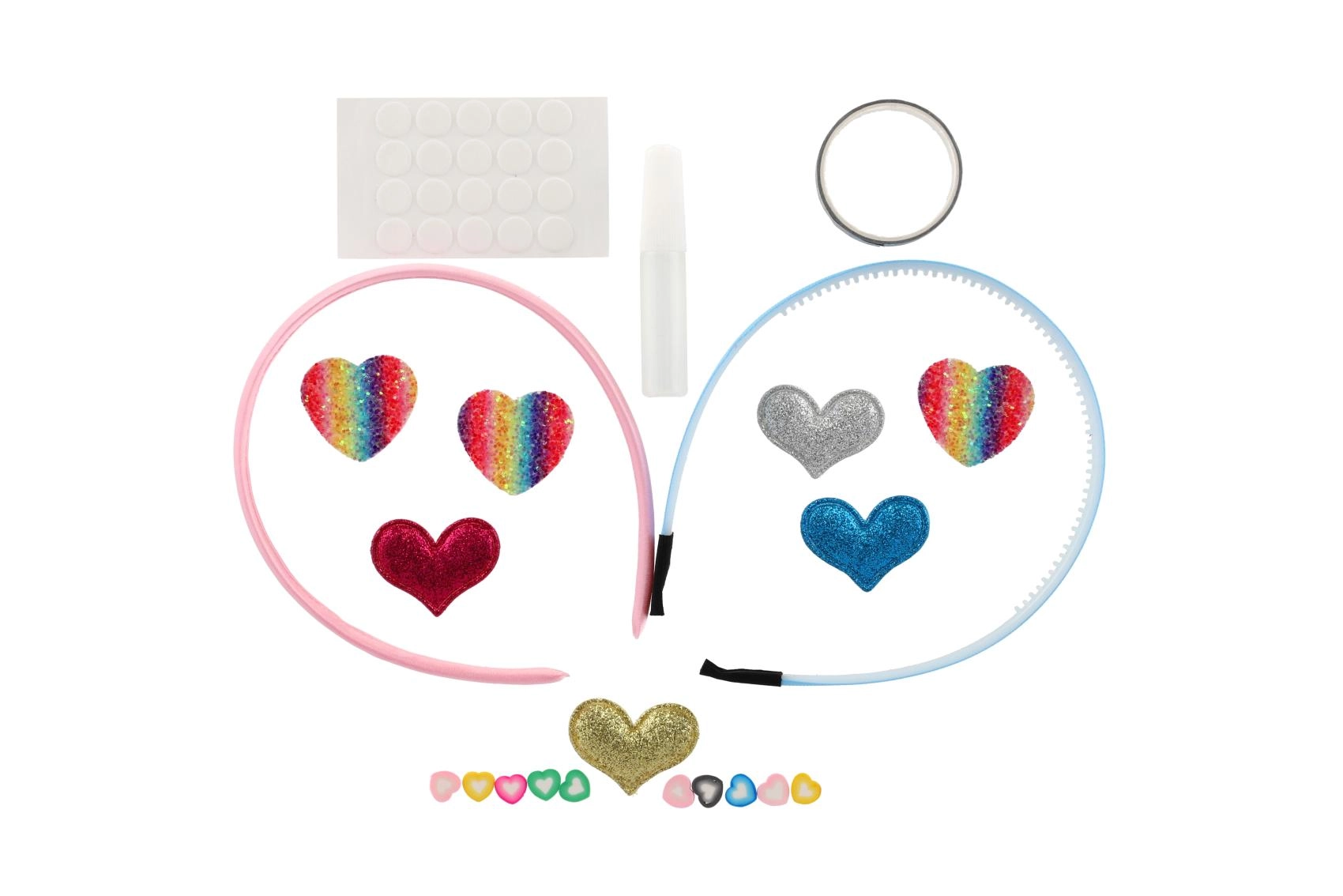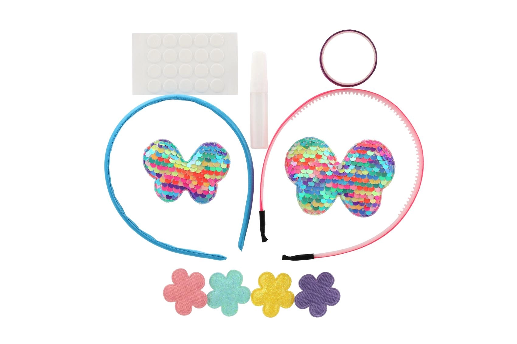 Dva plastična naglavna obroča, samolepilne pikice, majhno lepilo in množica dekoracij – od bleščečih aplikacij do kamenčkov. Dovolj je odpreti in začeti okraševati.