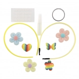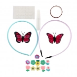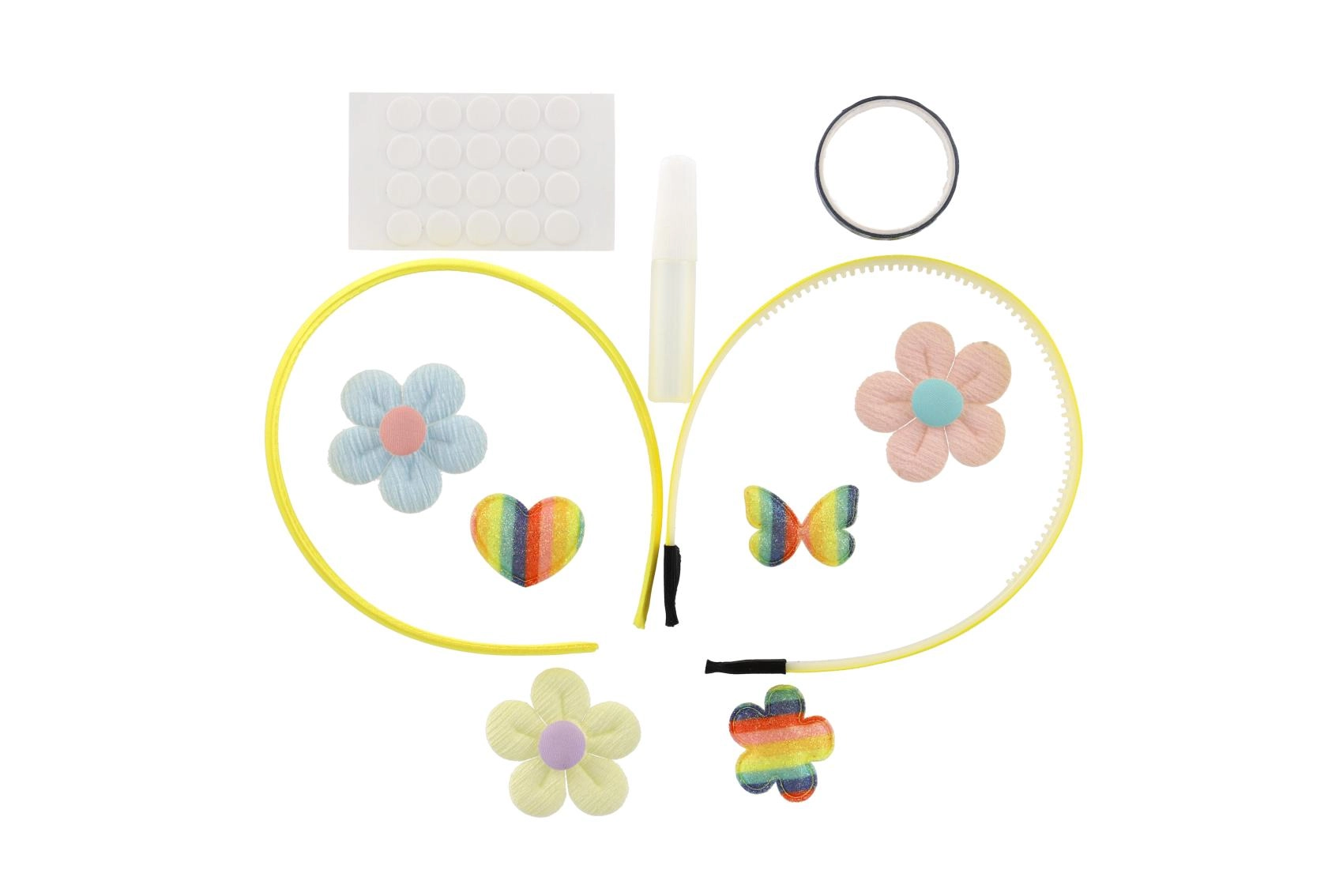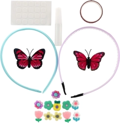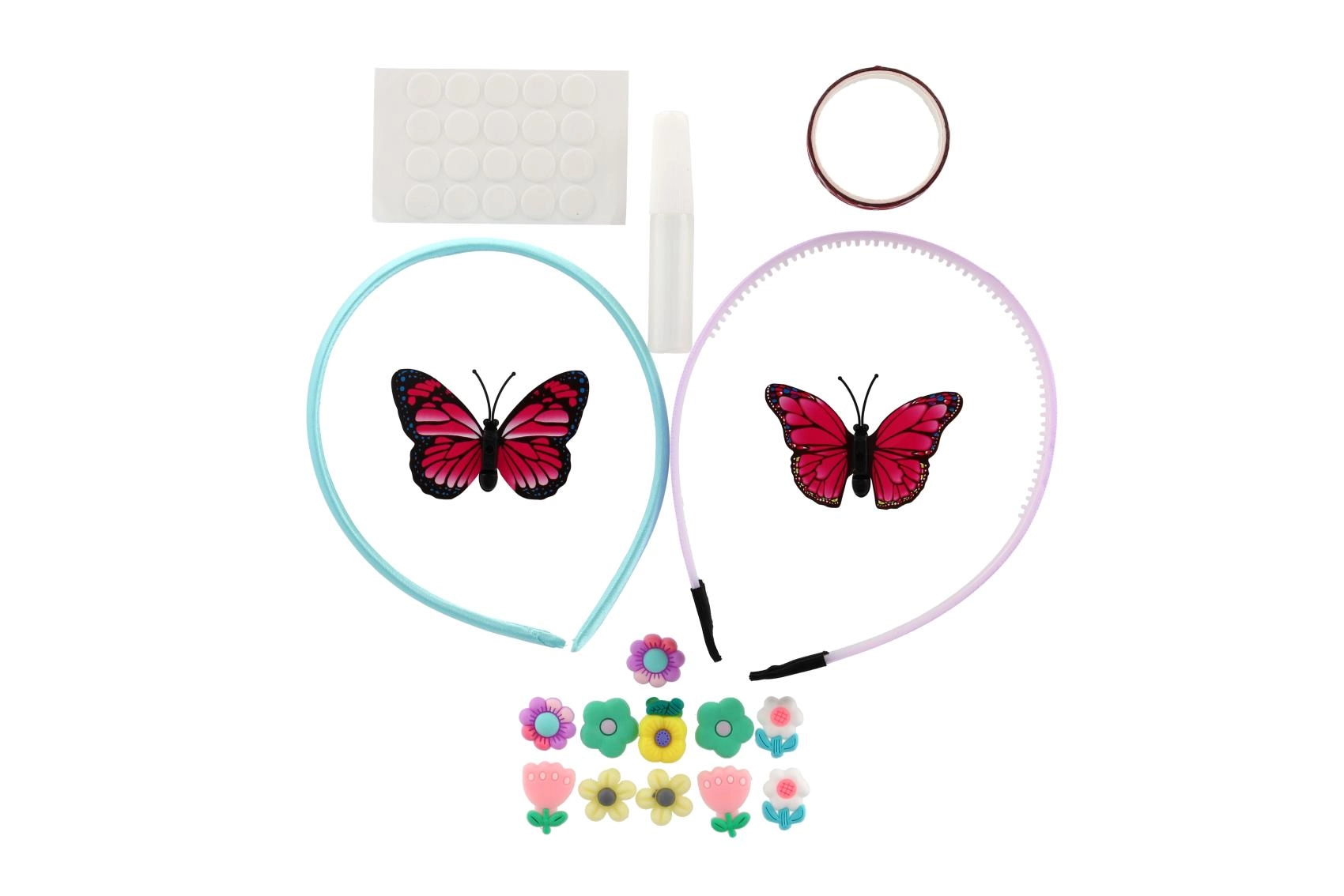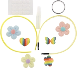 - 2 plastična naglavna obroča, mešanica dekoracij (aplikacije metulj, srce, cvet, kamenčki), samolepilne pikice, majhno lepilo; nekatere sete lahko vsebujejo trak/vrvico ali obroček