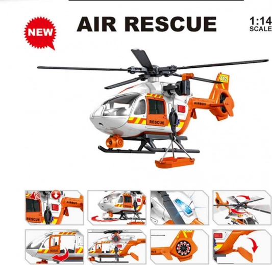 Otroci bodo cenili odpirajoča se stranska vrata in zadnjo loputo, premični kavelj s transportno košaro ter zložljive in vrtljive rotorje. LED osvetlitev spredaj, na vrhu in v kokpitu skupaj z avtentičnimi zvoki leta in alarmom še poudari vzdušje reševalnih akcij. Helikopter napajajo baterije 2× AAA (v paketu).