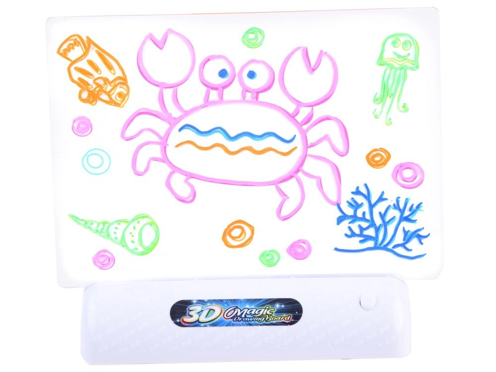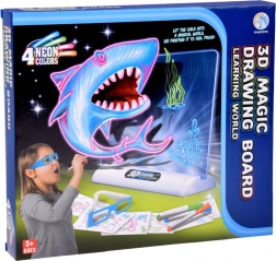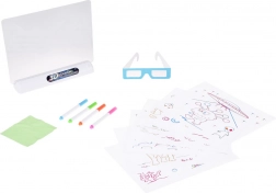 Odprite otrokom vrata v svet svetlobnih ilustracij. Prozoren panel na stabilnem stojalu zasveti in poudari neonske poteze, ki z priloženimi 3D očali dobijo učinkovit prostorski efekt. Otroci lahko rišejo lastne motive ali obrisujejo šablone ter v hipu ustvarijo svetlečo dekoracijo ali izvirno nočno lučko.
