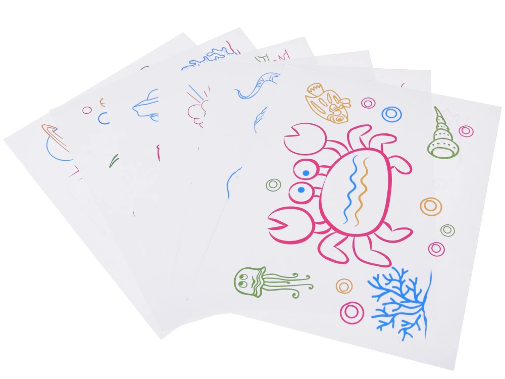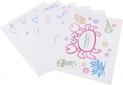 Priložene so obojestranske šablone z motivi morja. Otroci jih lahko vložijo za panel in udobno prekrivajo prve slike.