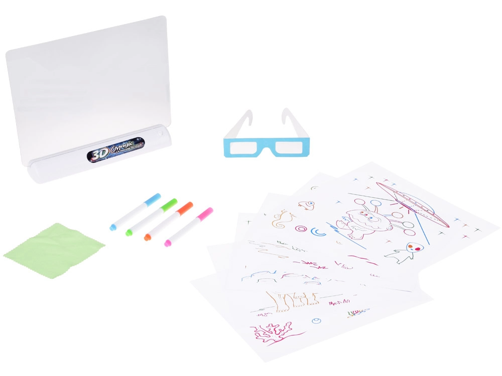 Prozorna plošča z LED osvetlitvijo poudari poteze flomastrov. Po namestitvi 3D očal slike dobijo realističen prostorski učinek in wow učinek.