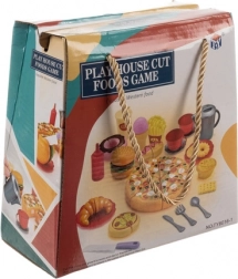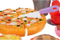 - Pica, rezalnik za pico, nož, 2× hot dog, hamburger (žemlja, solata, kotlet), pomfri, kečap, lonček s slamico, vrč, 2× skodelica s krožničkom, sladice (modelček, donut, krof, 3× piškot), pribor (žlica, nož, vilica), posoda, navodila