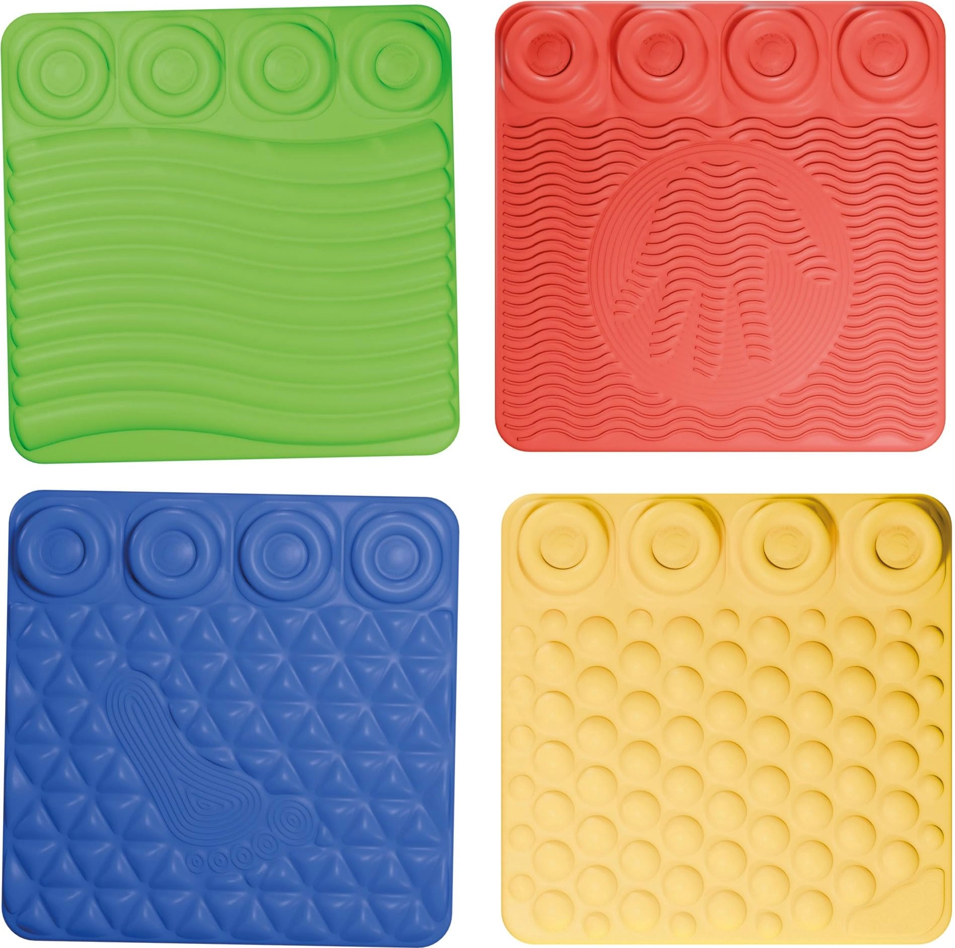 Vsaka podloga ima edinstven relief (valovi, pikice, oblike in sledi), ki nežno masira stopala in dlani ter krepi senzorično zaznavanje in ravnotežje.