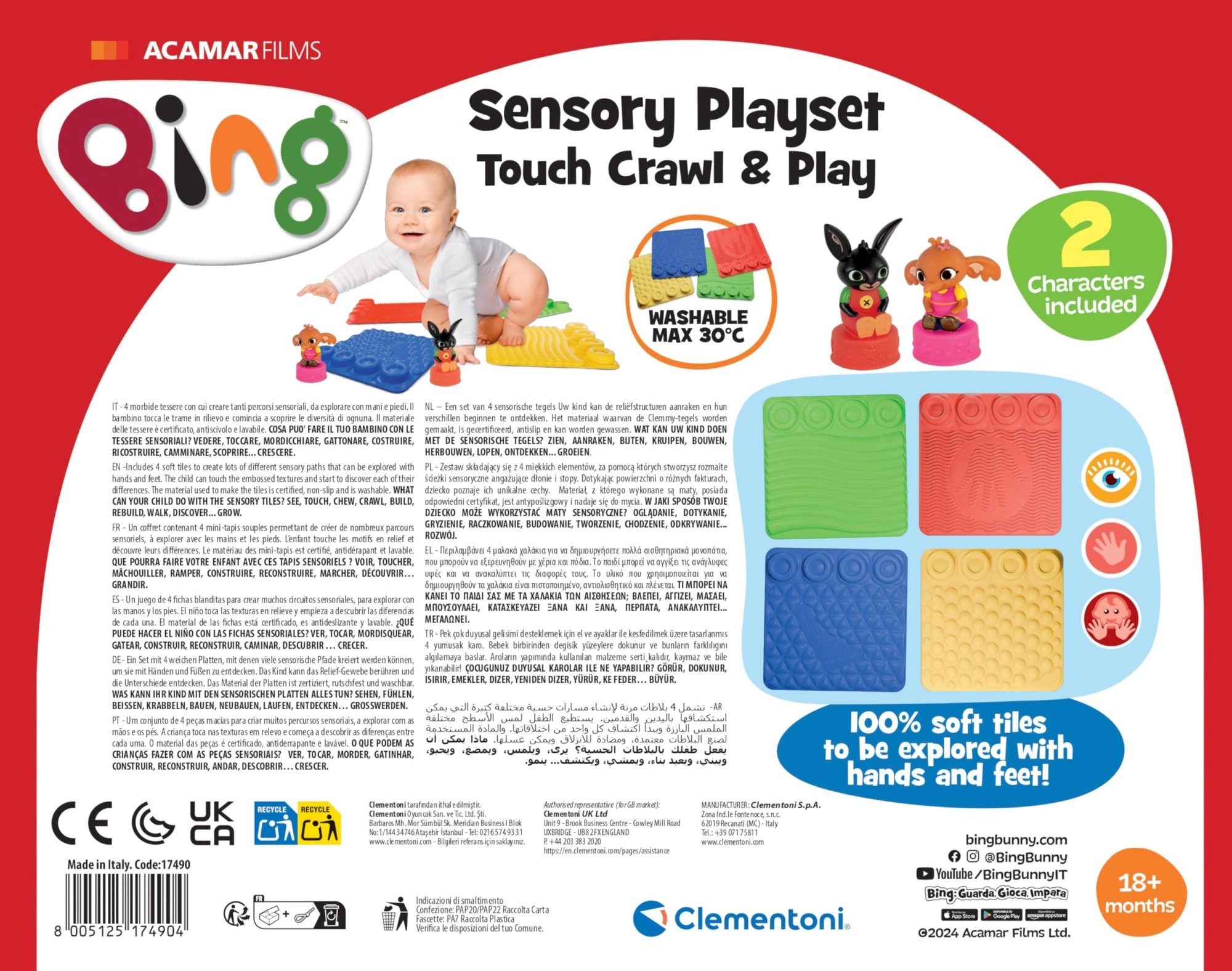 Podloge so iz mehkega plastika, prijetne na dotik in zasnovane za varno, nedrseče igranje. Kompaktne mere (pribl. 29 × 23 cm) omogočajo enostavno uporabo doma, v vrtcu in na poti. Proizvodnja v Italiji pri Clementoni je zagotovilo za kakovost in varnost.