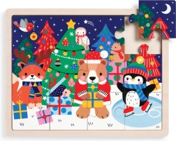 Otroške lesene puzzle MUDPUppy prinašajo čarobno praznično vzdušje z motivom veselih živalic, daril in okrašenih drevesc. Veliki in prijetno “polni” koščki se zlahka držijo v malih rokah in se sestavljajo neposredno v vzdržljiv lesen podstavek, zato se noben košček ne izgubi.