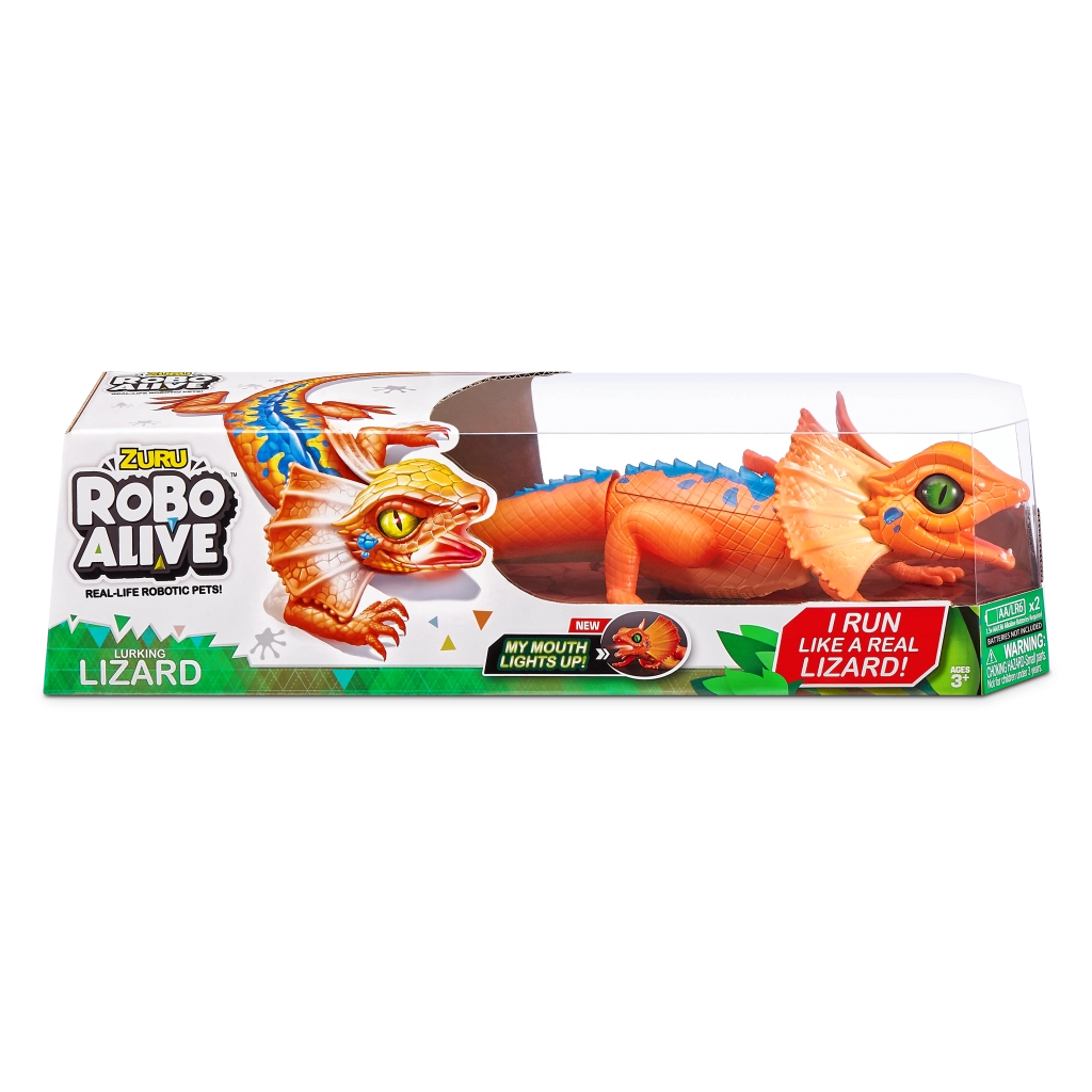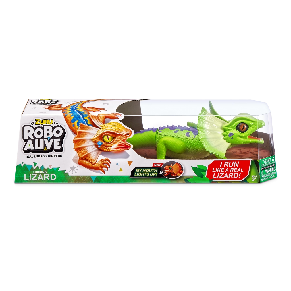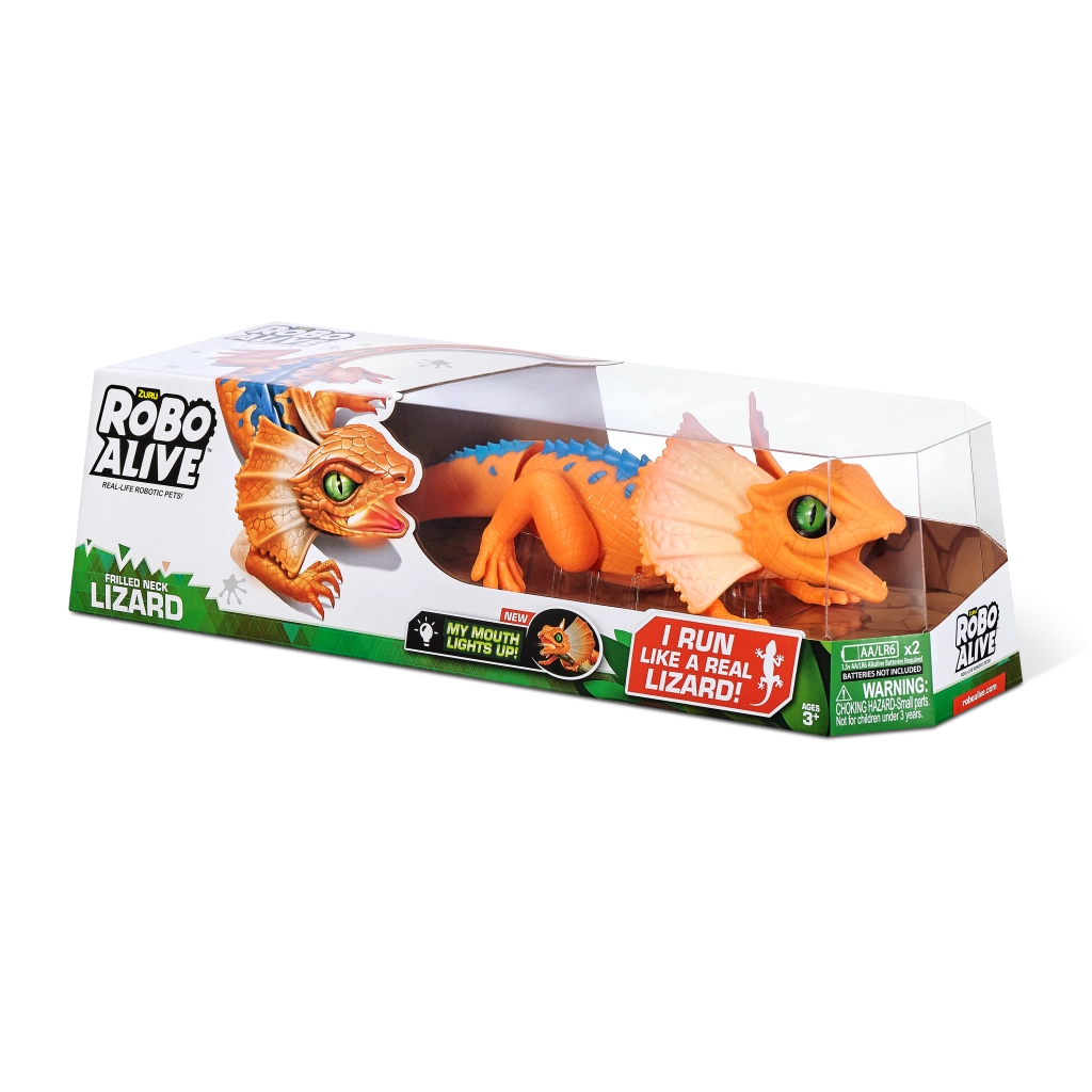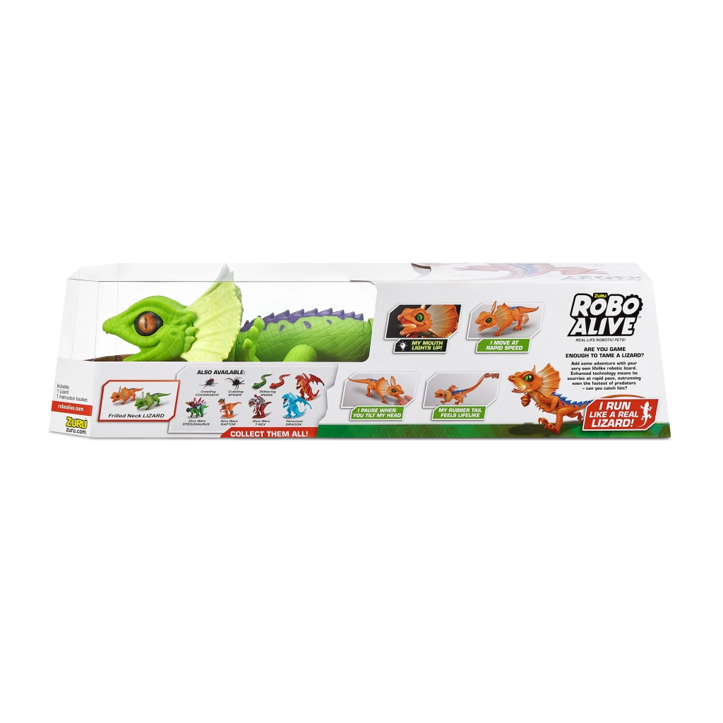 Robotski kuščar ROBO ALIVE prinaša otrokom akcijsko igro, polno gibanja. Zahvaljujoč motornemu pogonu in premišljeni konstrukciji zmore hiter tek, gladko obračanje glave in stabilen korak. Realistična tekstura lusk, frill (vratni ovratnik) in izrazite barve igrački dajejo avtentičen videz.