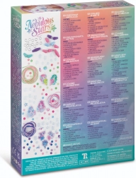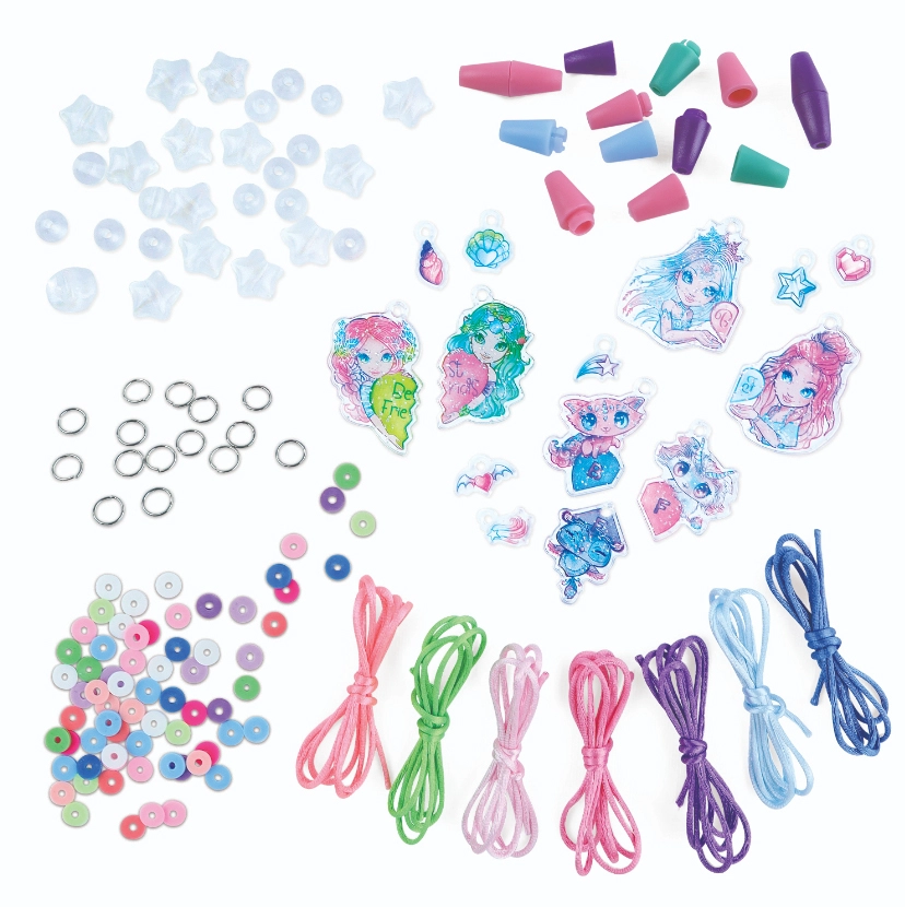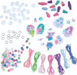 - 7 velikih bleščečih akrilnih obeskov, 7 malih akrilnih obeskov, 98 različnih perlic, 14 spojnih obročkov, 7 barvnih satenastih vrvic, polje s samolepilnimi kamenčki, barvni priročnik