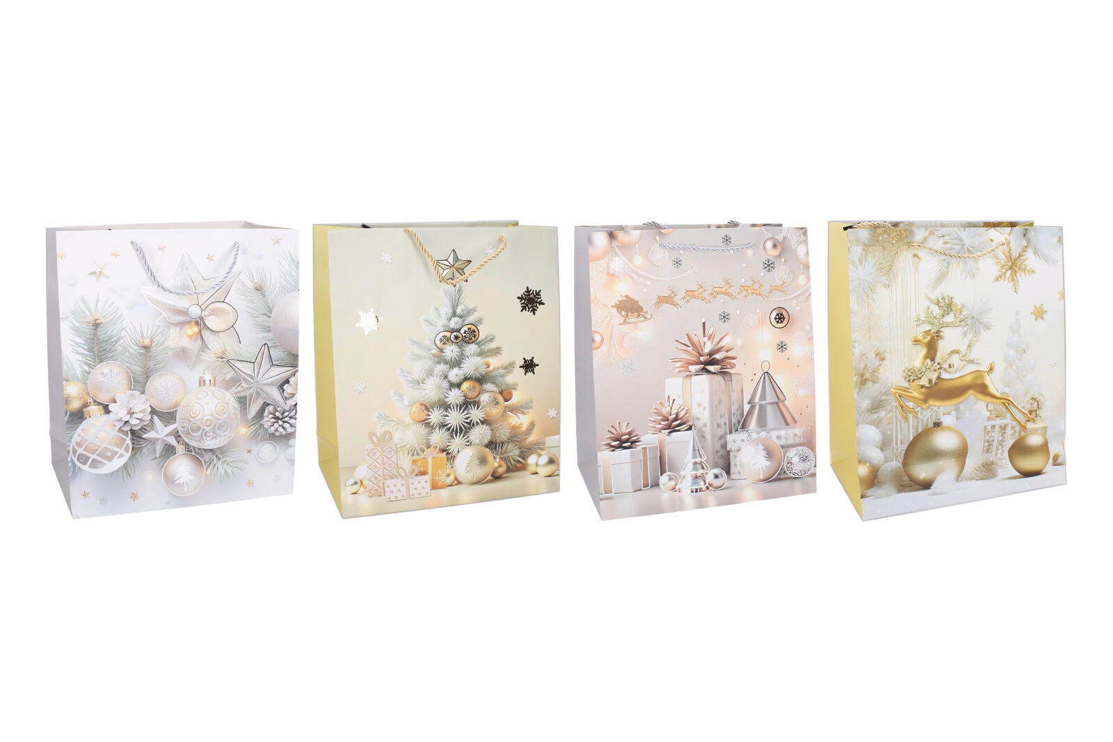 Elegantna darilna vrečka velikosti L za veselo praznično zavijanje. Idealna za srednje velike do večje darove, z božičnimi motivi za popolno vzdušje. Na voljo v 4 različicah, s praktičnimi merami 31 × 40 × 12 cm in vzdržljivo izvedbo za varno prenašanje.