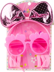 Stajliš rožnat komplet dodatkov za male dame vsebuje otroška očala igrive oblike, naglavni trak z veliko mašno in 6 elastik za lase. Lahka in varna zasnova je idealna za vsakodnevno nošenje, igranje stilistke in princeskine preobleke.