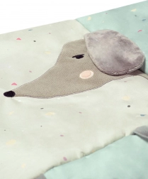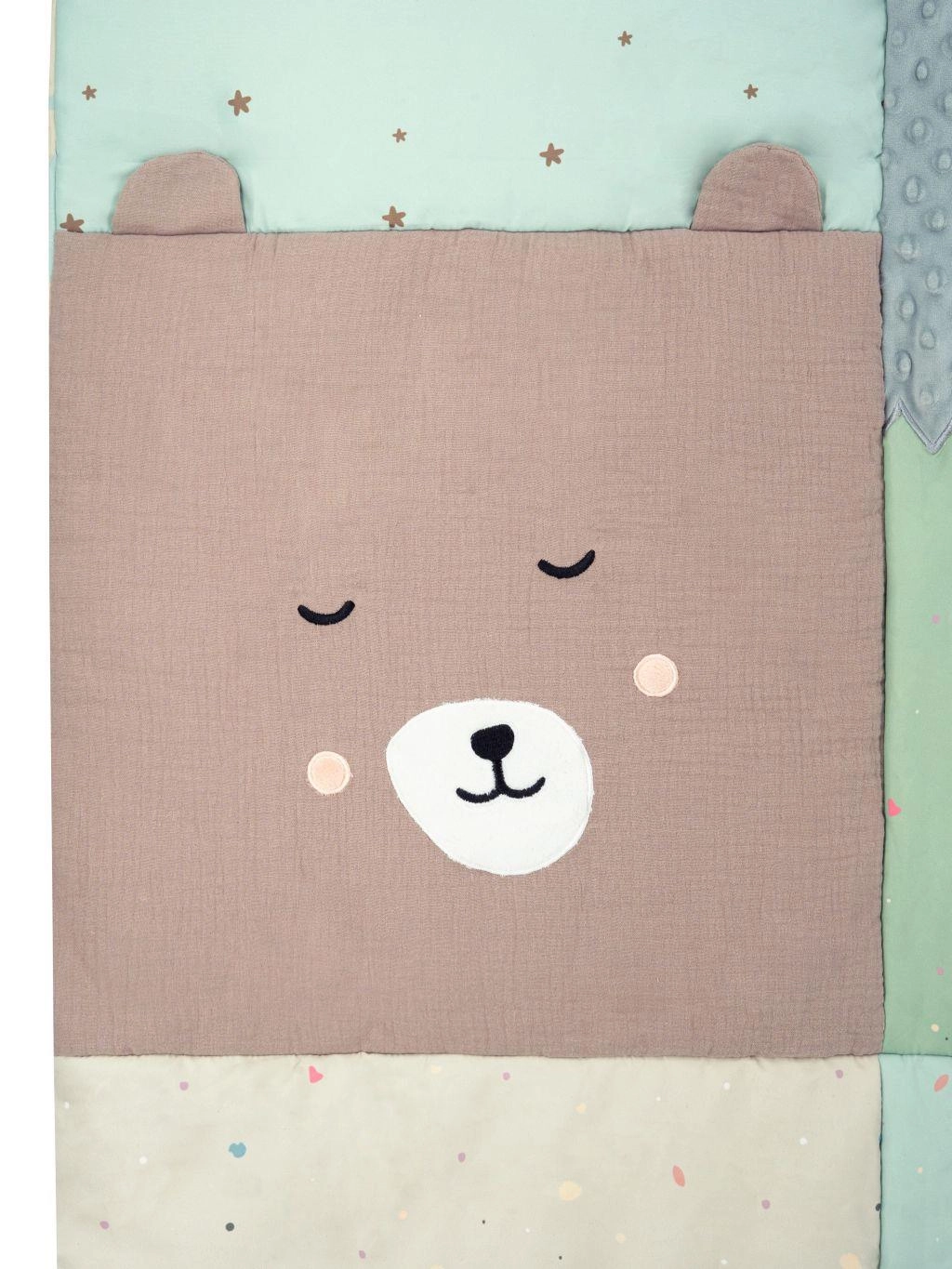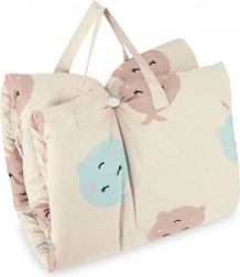 Praktična zasnova omogoča, da podlogo zložite v torbo in jo pritrdite z gumbi – tako jo zlahka odnesete na piknik, v park ali na plažo. Nežne, umirjene barve ne motijo in pomagajo otroku zaznavati posamezne elemente, kot so živalice in ljubki medvedki MoMi. Izdelek izpolnjuje standarde EN 71-1/2/3 in je primeren za otroke od rojstva.
