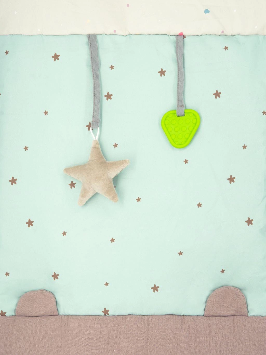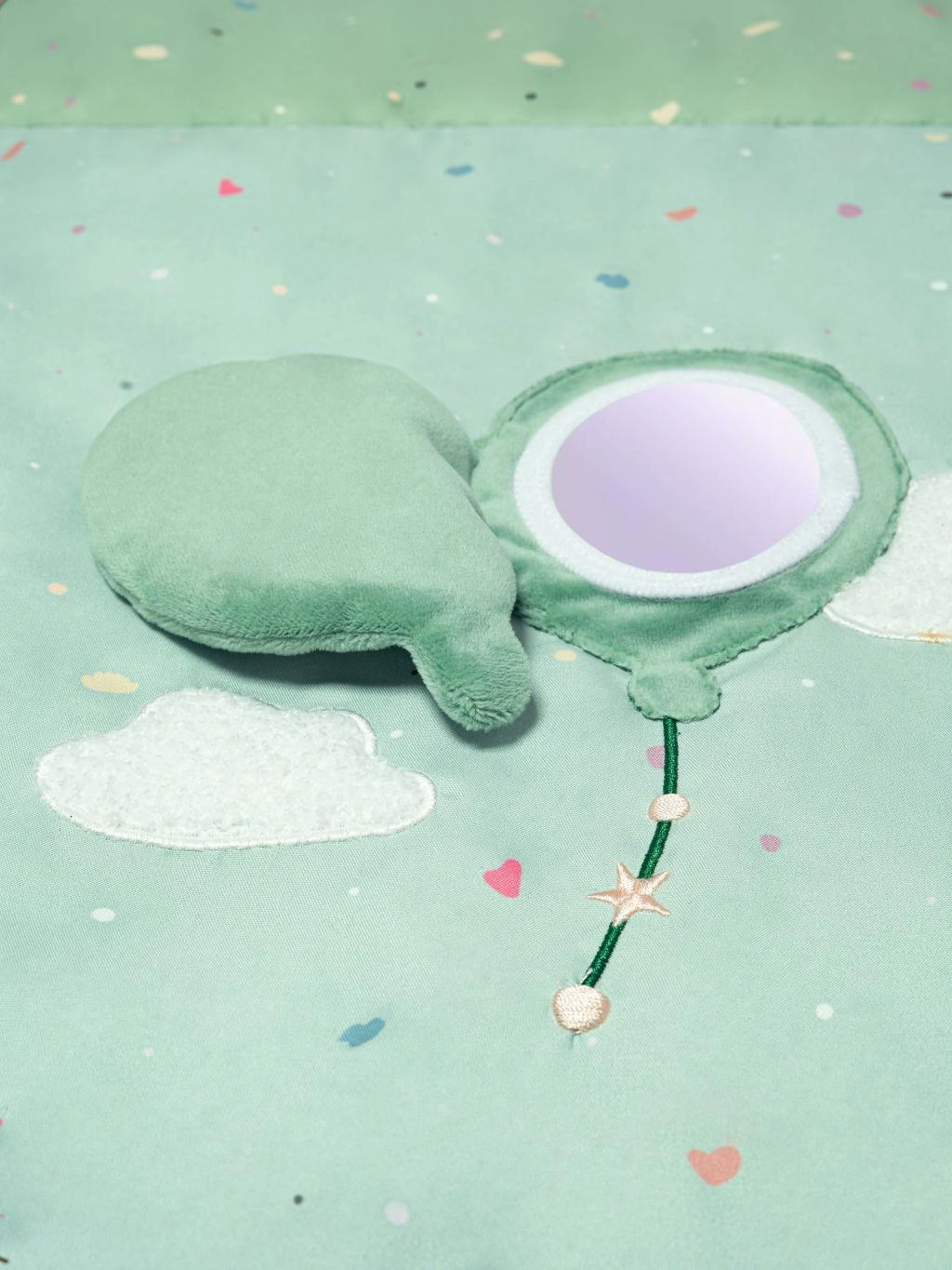 Vgrajeno ogledalce, šumeči deli, piskalke, grizalo in mehke aplikacije spodbujajo vid, sluh in fino motoriko od rojstva.