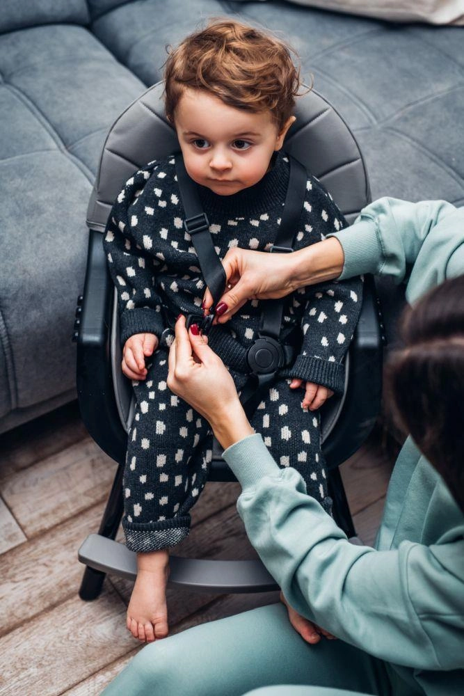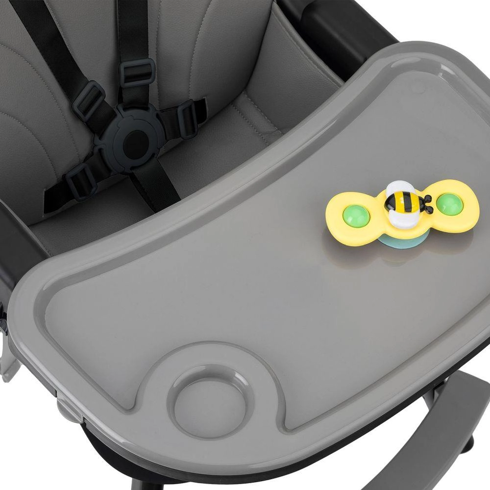 Stabilna konstrukcija, opora za noge in varnostni pasovi zagotavljajo udobno in varno sedenje. Priložena je igrača z priseskom za zabavo med čakanjem na obrok.