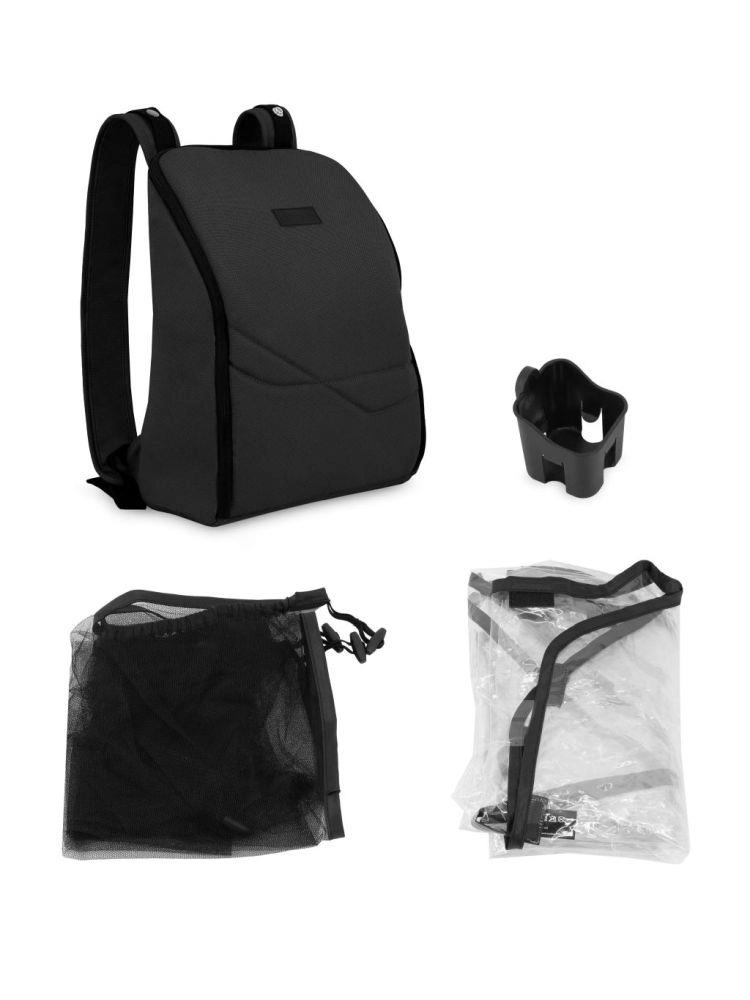 V paketu je praktičen pribor: nahrbtnik, držalo za pijačo, mreža proti komarjem in dežna prevleka. Košara z nosilnostjo 2 kg sprejme vse potrebno za sprehod. Izbirni komplet adapterjev omogoča povezavo dveh vozičkov v tandem ali dvojno različico – odlična rešitev za rastočo družino.