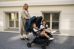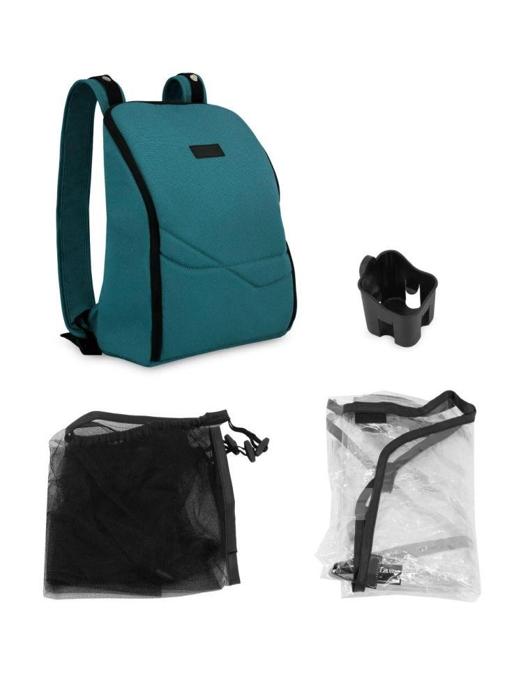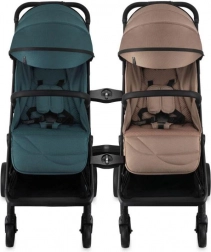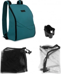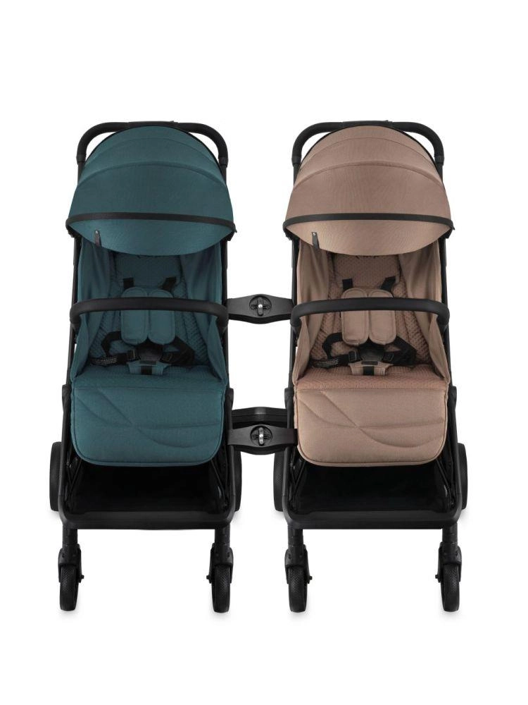 V kompletu prejmete vse potrebno: stilen nahrbtnik za voziček, držalo za pijačo, mrežo proti komarjem in dežno prevleko. Izbirni povezovalni komplet adapterjev omogoča povezavo dveh vozičkov v praktično bratsko/dvojčko rešitev. Ne manjkajo 5-točkovni varnostni pasovi in prostorna košara z nosilnostjo 2 kg.