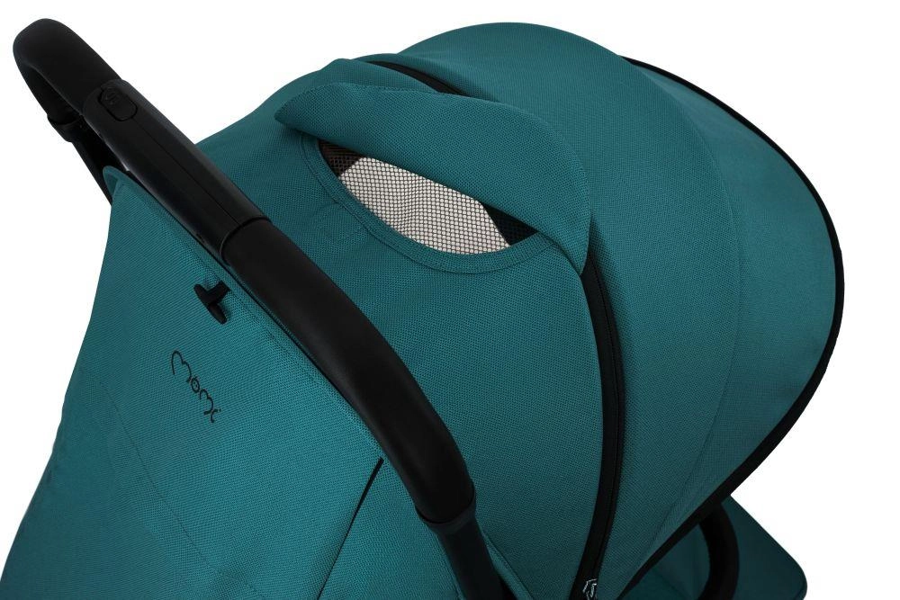 Nastavljivo naslonjalo in 4-stopenjska opora za noge, strehica s kontrolnim okencem ter zadnje mrežasto prezračevanje za udobje otroka.