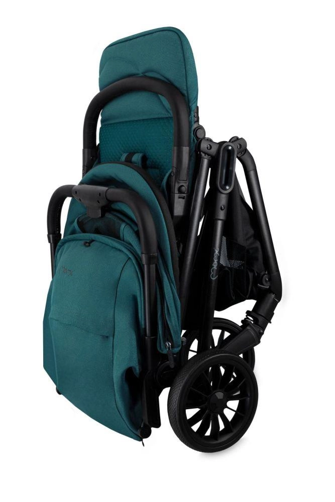 Samozložitveni mehanizem prihrani čas in prostor – voziček se po pritisku na gumb sam zloži in v zloženem stanju stabilno stoji.