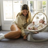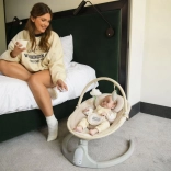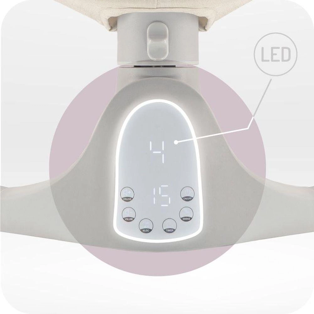 Vgrajen modul Bluetooth in 10 melodij z nastavljivo glasnostjo ustvarita prijetno vzdušje. Petstopenjska nastavitev amplitude guganja verno posnema naravno gibanje v maminih trebušnih gibih, časovnik na 8, 15 ali 30 minut pa pomaga vzpostaviti idealno rutino uspavanja. Protizdrsne podloge in 5-točkovni pasovi zagotavljajo največjo varnost.