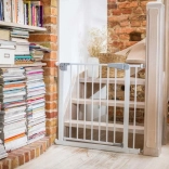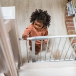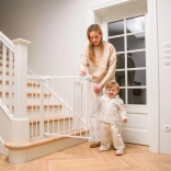 Za maksimalen mir izpolnjuje ograja evropski standard EN 1930 in zahteve EN71-2 in EN71-3. Pri odprtju na 90° vrata ostanejo odprta, kar olajša prenašanje nakupov ali rokovanje z vozičkom. Gladke linije brez ostrih robov in vzdržljiva konstrukcija se podajo sodobnim interierjem in stopniščem.