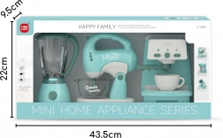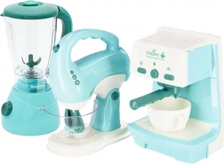 Stilski in funkcionalni komplet AGD 3v1 za male kuharje ponuja vse, kar je potrebno za domačo kavarno ali kuhinjske eksperimente. Otroci bodo uživali v realistični igri zahvaljujoč točenju vode iz kavnega aparata, vrtečima metlicama mešalnika in vrtečemu nožu blenderja. Vgrajeni svetloba in zvok še okrepita doživetje in približata igro pravemu kuhanju.