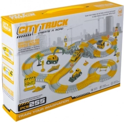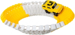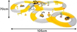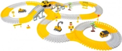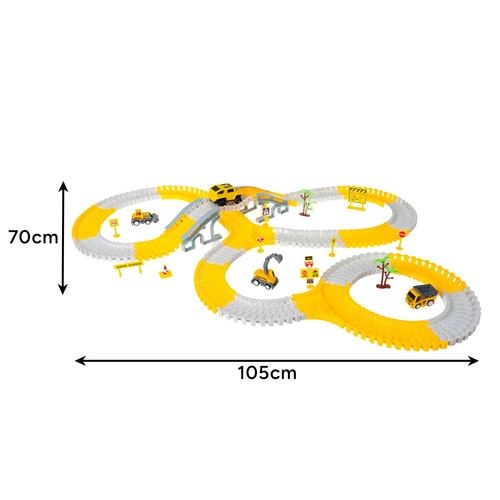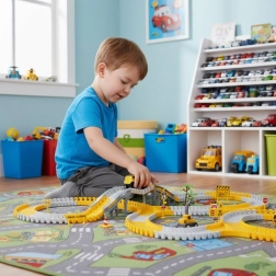 Ustvarite svoj krog z gradbeno tematiko – zahvaljujoč prilagodljivim, klik-segmentom lahko sestavite ravnine, zavoje, zanke in most. Otroci lahko nenehno spreminjajo konfiguracije, preizkušajo nove trase ter jih dopolnjujejo z znaki, zapornicami in drevesi. Žive barve, funkcionalni dodatki in avtomobilček na baterije zagotavljajo dinamično in privlačno igro.