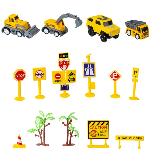 Bager, valjar in prekucnik skupaj s prometnimi znaki, stožci, ovirami in palmami ustvarjajo avtentičen gradbeni svet za ure domiselne igre.