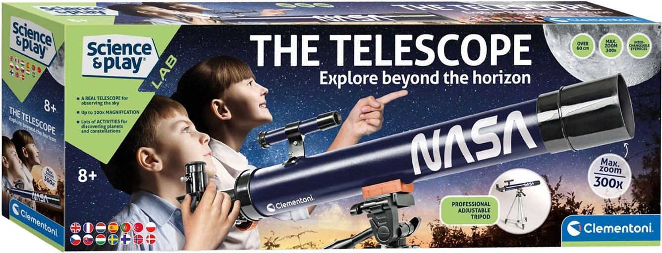 Odkrijte nočno nebo z otroškim teleskopom CLEMENTONI iz serije Science & Play. Ta kakovosten astronomski daljnogled, navdihnjen z NASA, ponuja povečavo 50× do 100×, dopolnjeno z Barlow lečo za trojno povečavo. Zaradi 50 mm objektiva in robustnega stojala do 130 cm je idealen za prva opazovanja Lune, zvezd in planetov. Priložen je ilustriran priročnik, ki otrokom razloži osnove astronomije. Primerno od 8 let, odlična STEM igrača za učenje in zabavo.