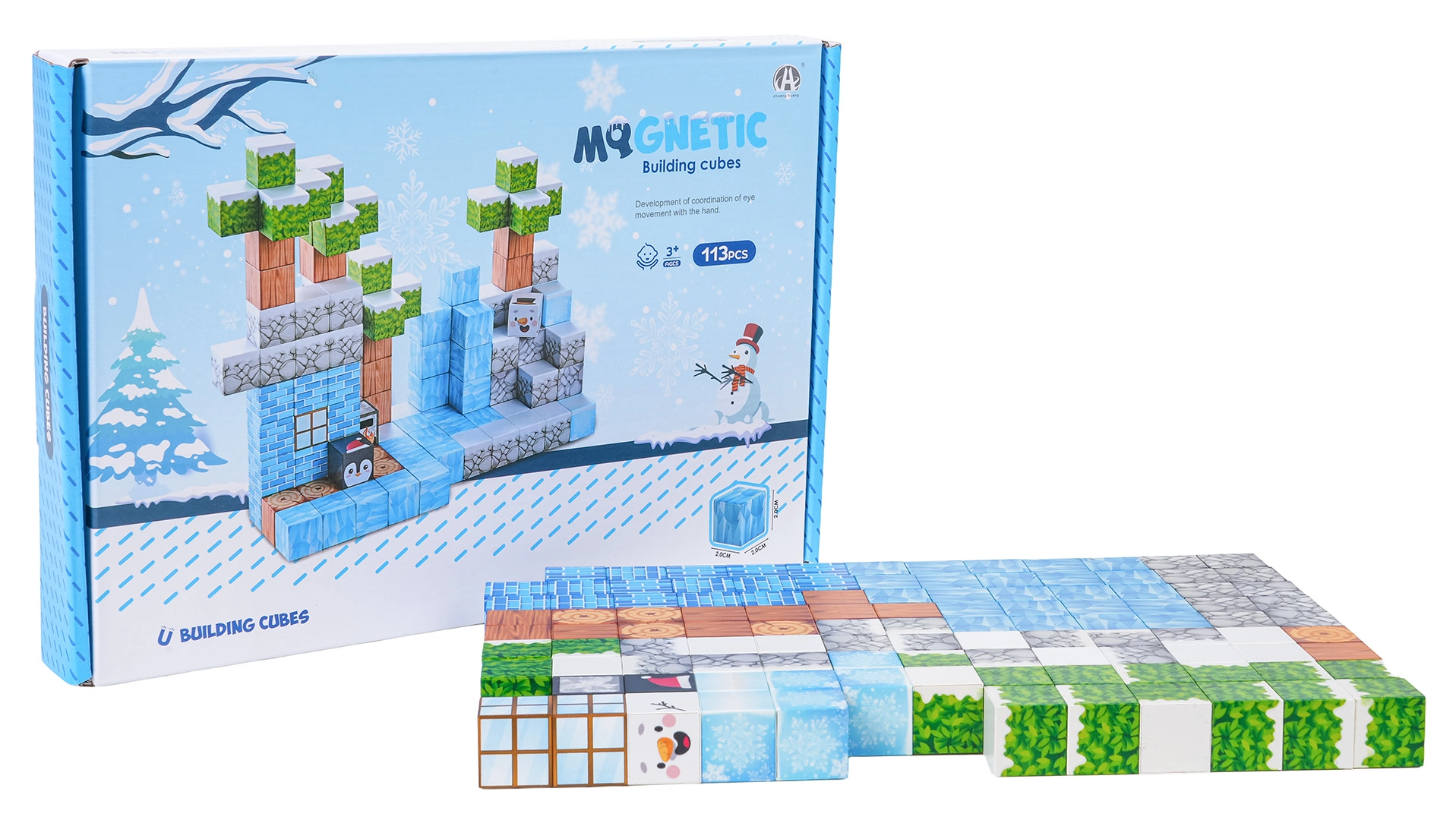 - 113 barvitih 3D kock s tematskimi potiski zimske pokrajine