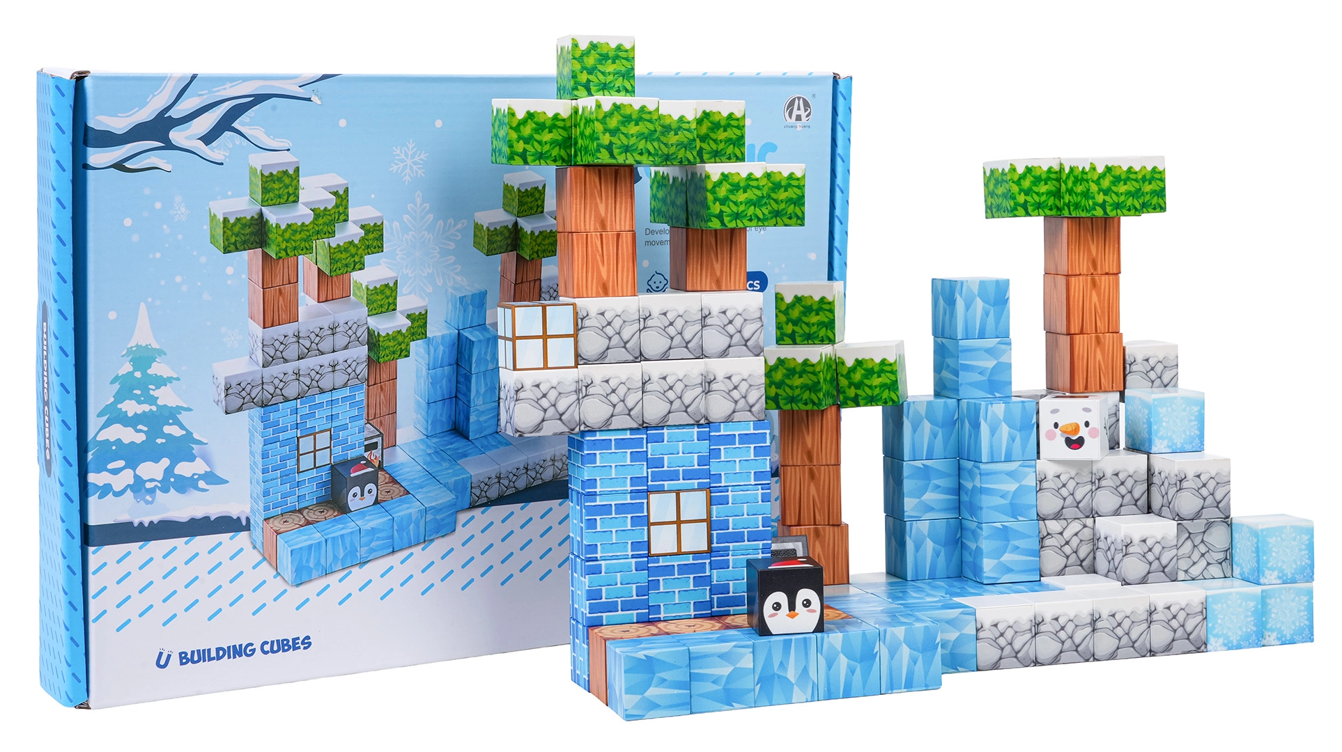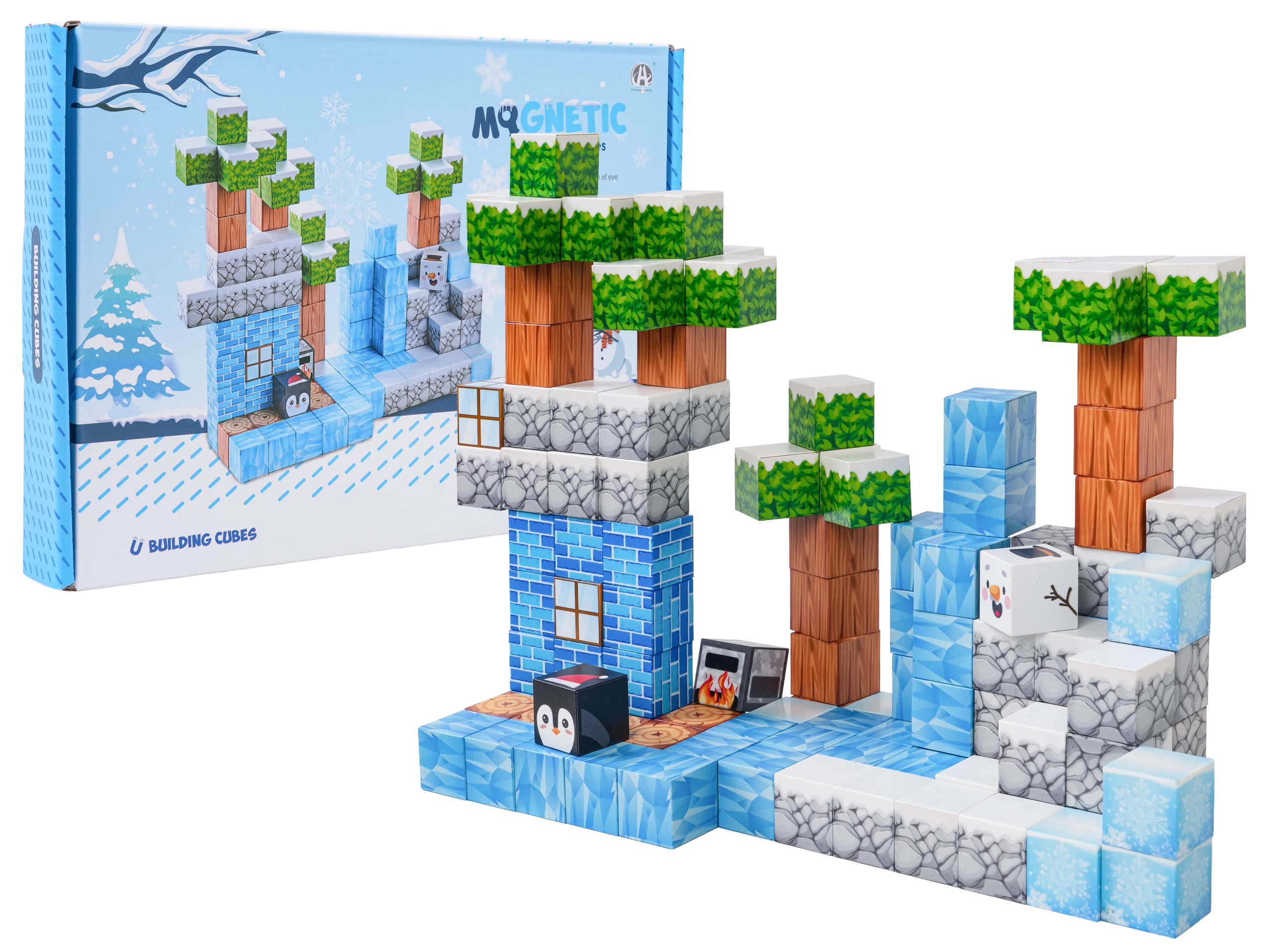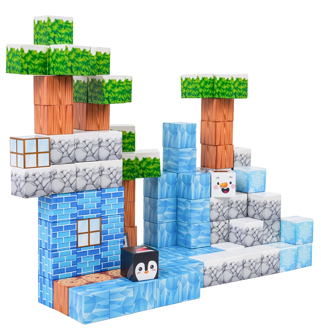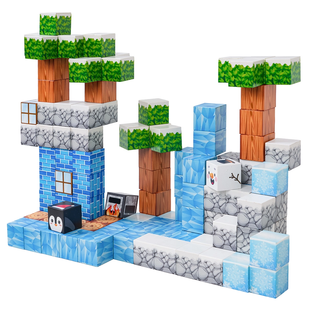 Ta bogat komplet omogoča otrokom neskončne možnosti gradnje – od zimskih prizorov do izvirnih terenov in zgradb. Kocke s potiskanimi teksturami (led, les, kamen, opeke, zelenje) se varno in trdno povezujejo zahvaljujoč neodimskim magnetom, zato modeli ohranjajo obliko tudi pri daljši igri.