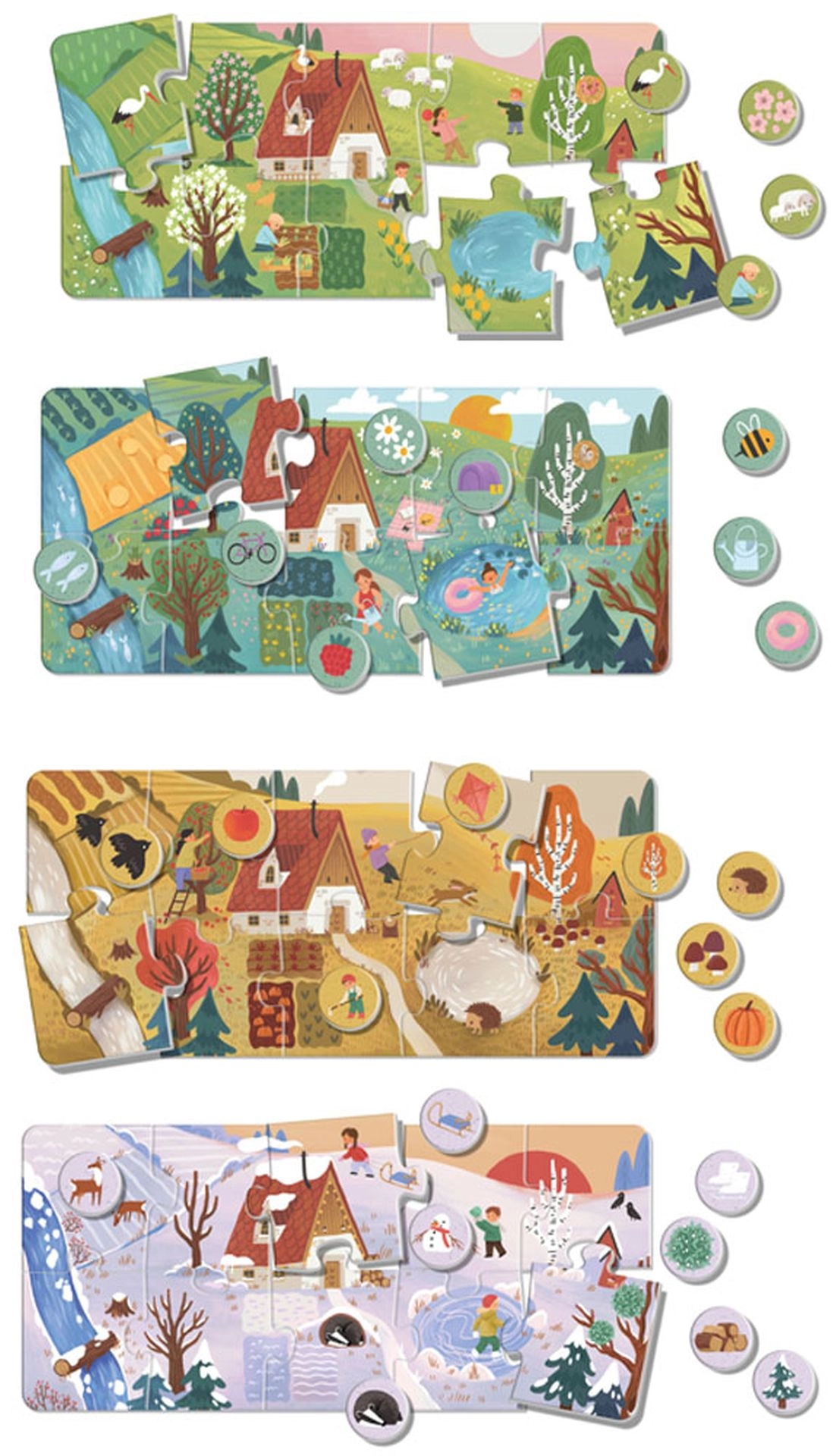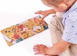 Velike sestavljanke loto letni časi KukiKuk otrokom prinašajo štiri čudovite scene – pomlad, poletje, jesen in zimo. Vsak letni čas otroci sestavijo iz 10 velikih koščkov, nato pa priraščajo 8 okroglih žetonov s tipičnimi motivi. Po načelih Montessori otroci samostojno odkrivajo, razvrščajo in povezujejo elemente na podlagi čutnega zaznavanja.