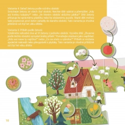 Pomlad, poletje, jesen in zima v bogato ilustriranih prizorih. Otroci spoznavajo spremembe v naravi in običajne dejavnosti skozi leto.