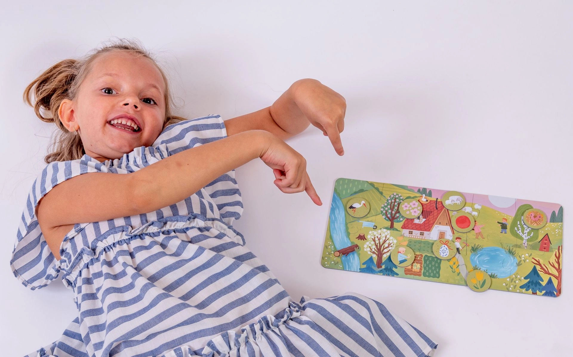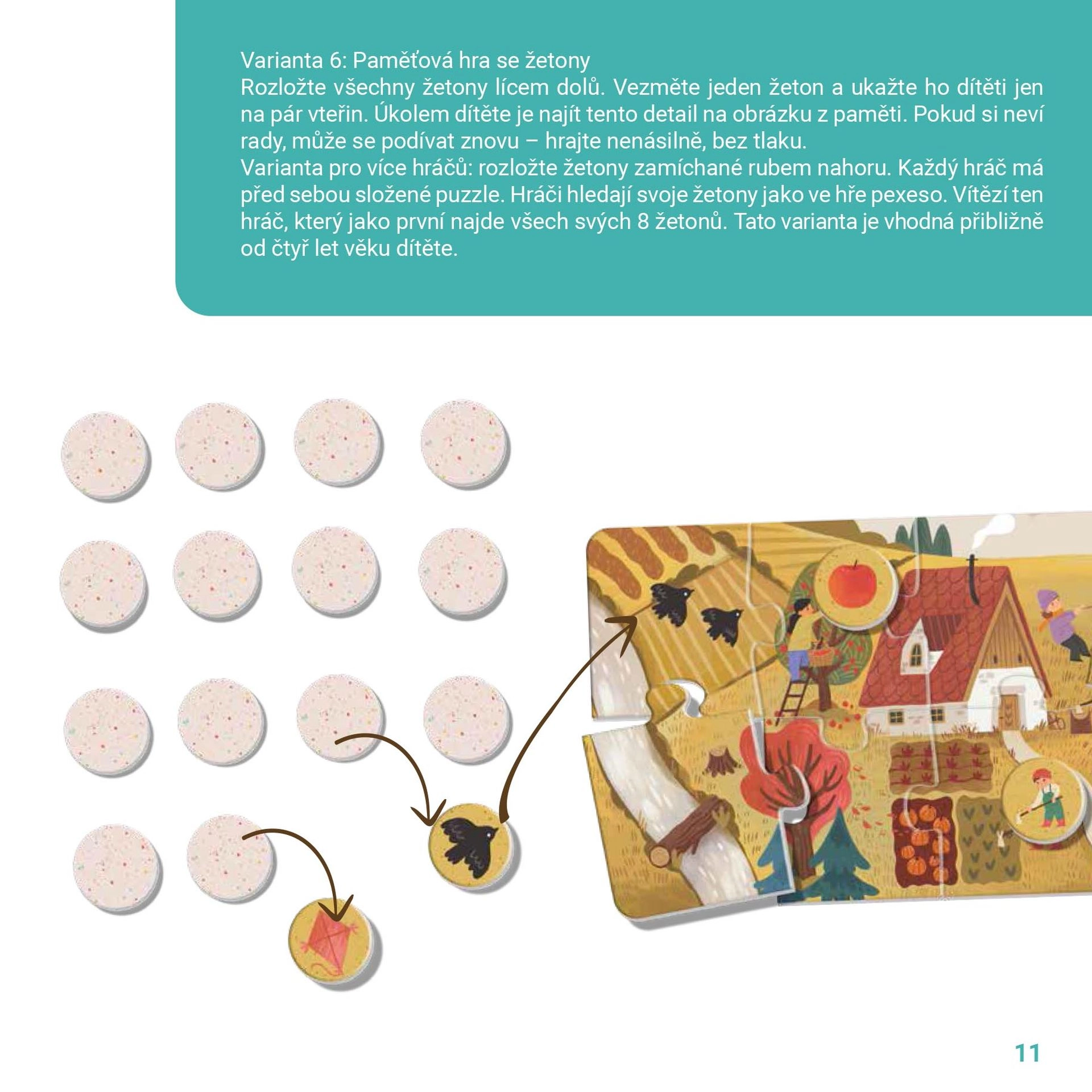 Otroci samostojno odkrivajo, razvrščajo in priraščajo žetone k dokončanim slikam. Razvijajo pozornost, logično razmišljanje in besedni zaklad.