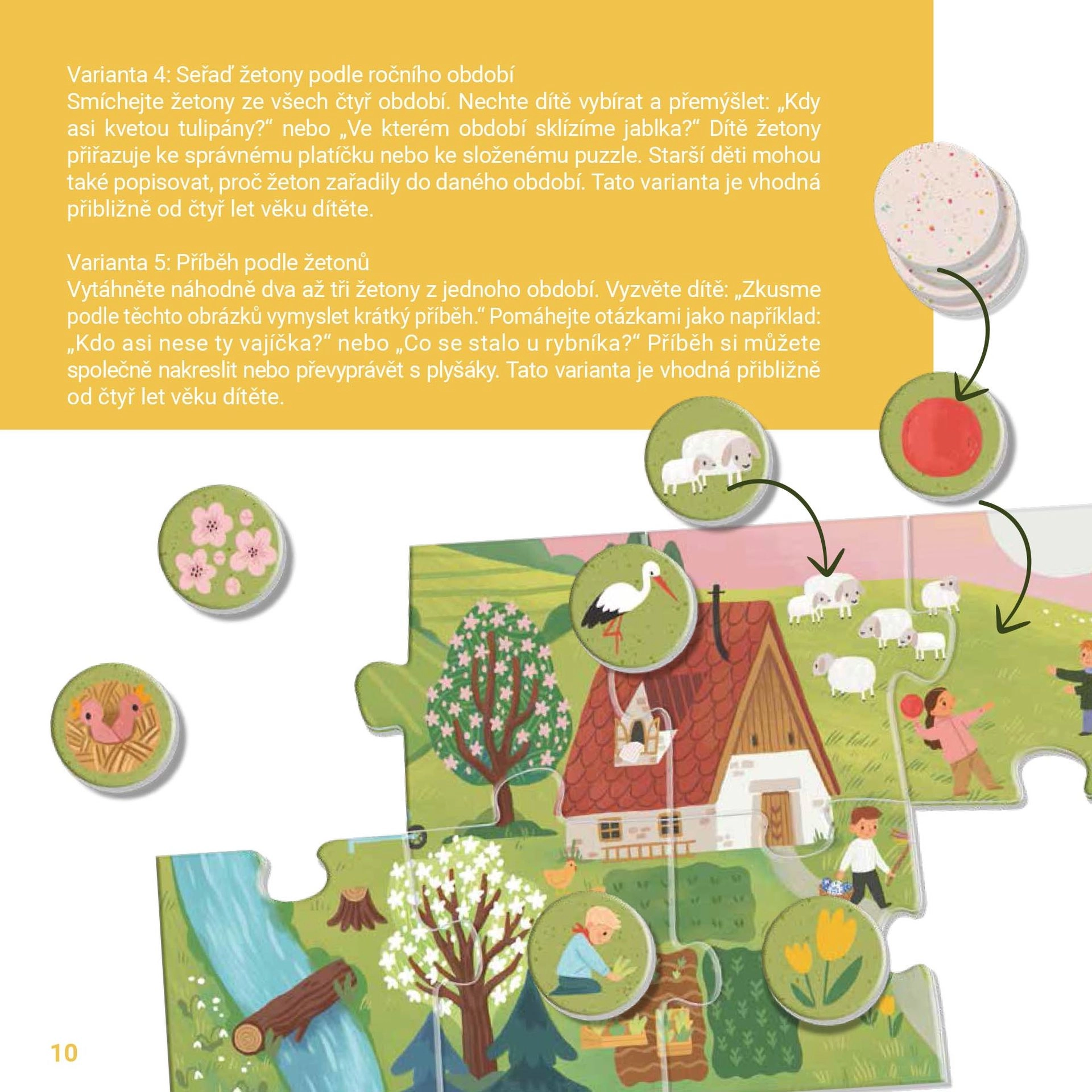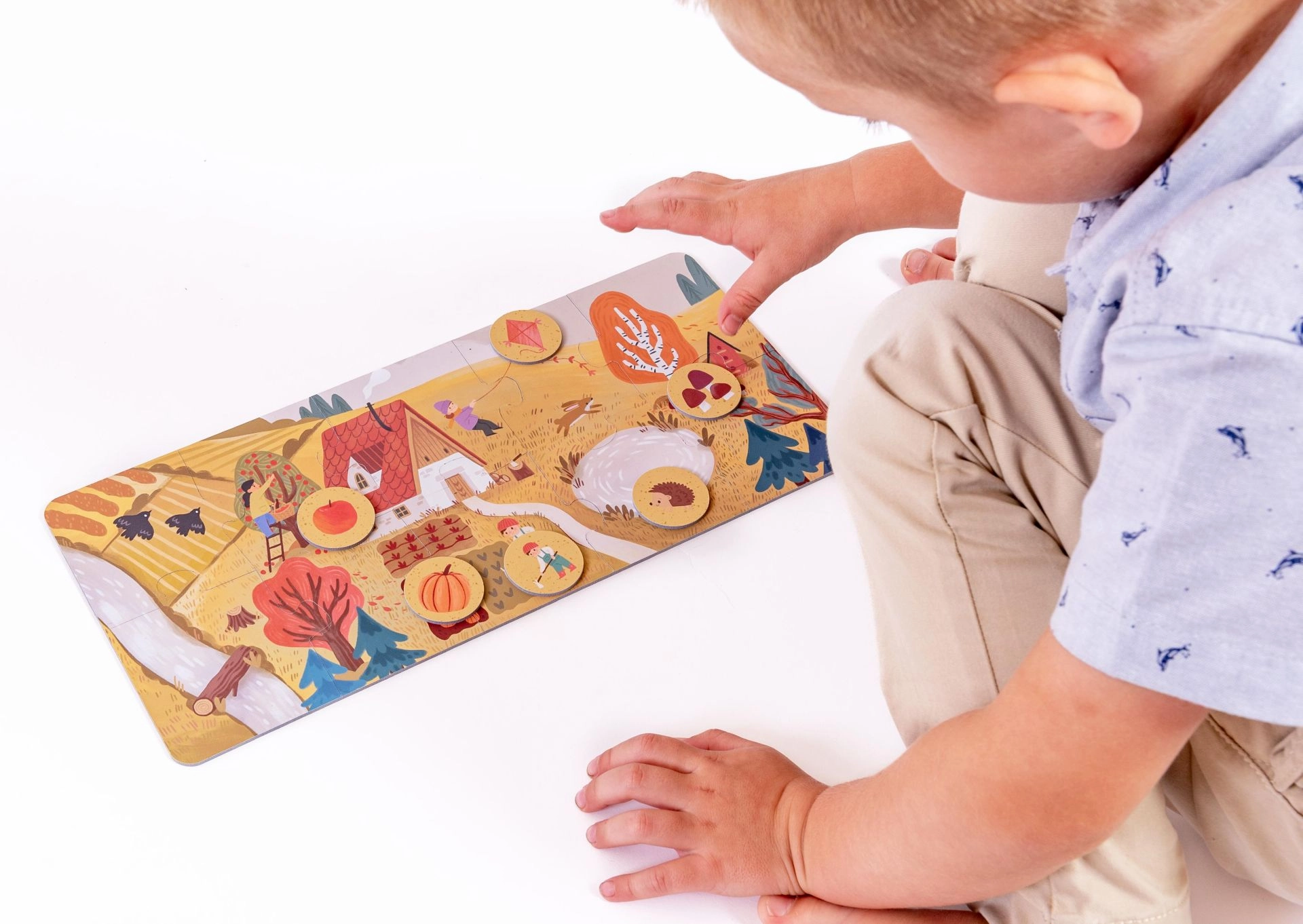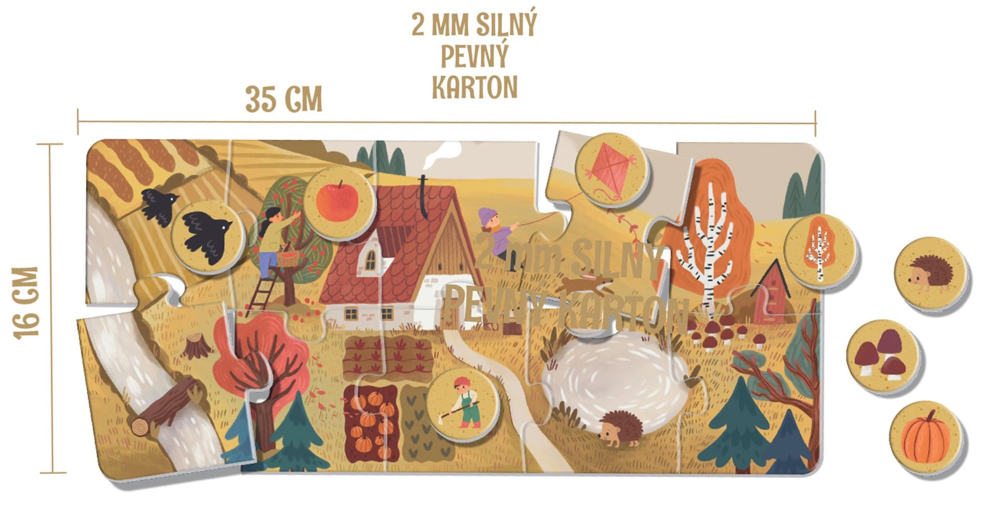 Igra je zasnovana za majhne ročice: izjemno veliki koščki iz 2 mm FSC kartona so odporni, enostavni za prijem in popolnoma brez plastike. Učenje poteka naravno – otroci urijo pozornost, bogatijo besedni zaklad in se pogovarjajo o spremembah v naravi skozi leto.