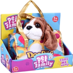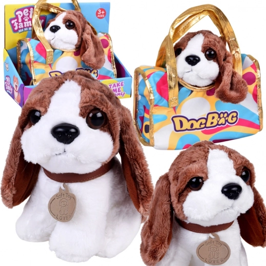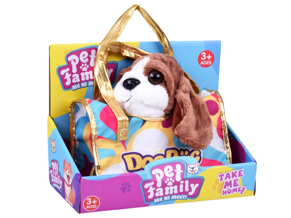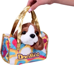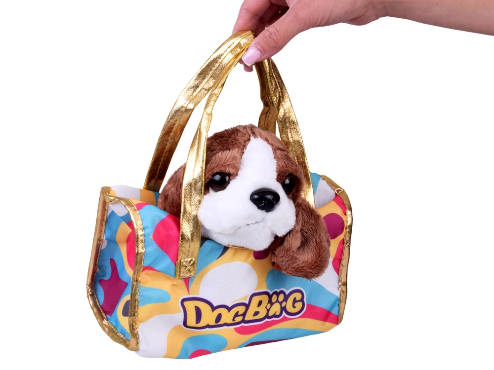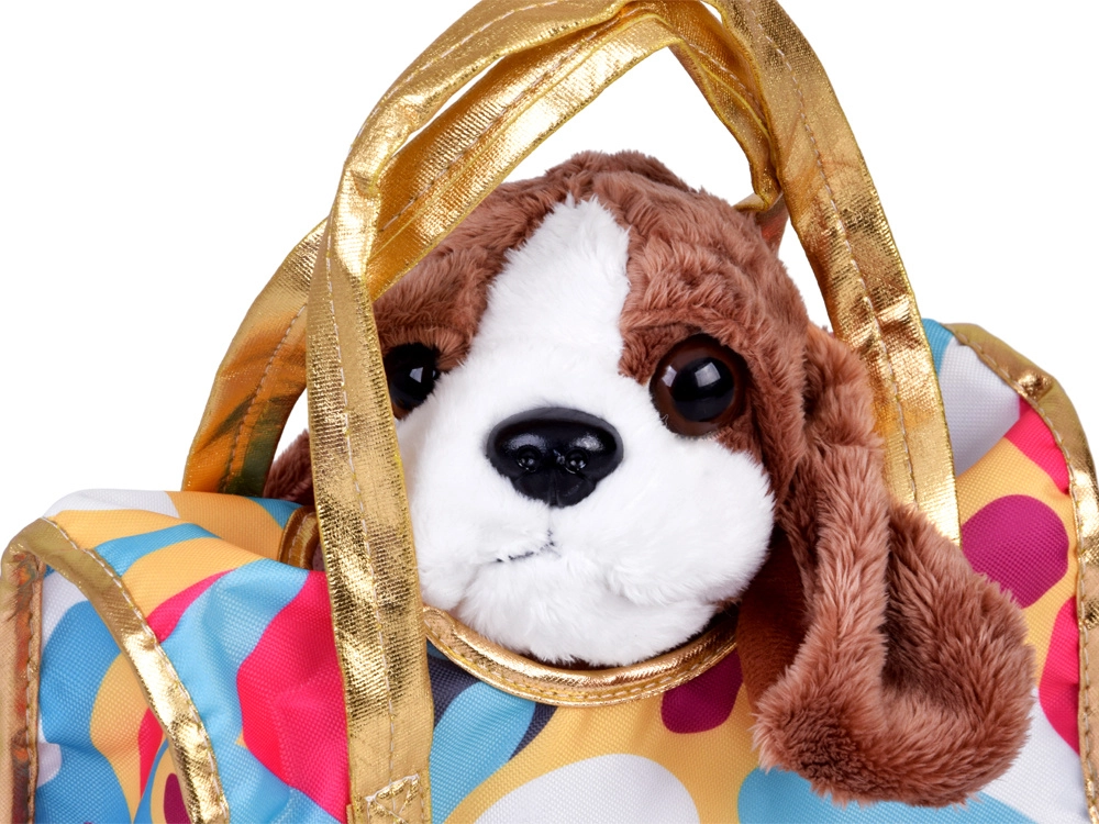 Ta prisrčen plišasti kužek bo hitro postal zvest spremljevalec pri uspavanju, igri in na izletih. Realistični detajli, kot so mehka ušesa, bleščeče oči in prisrčen smrček, spodbujajo otrokovo domišljijo in razvoj empatije do živalic. Priložena je stilska prenosna torbica z večbarvnim vzorcem in zlatimi ročaji, zaradi katere je igra »sprehajanja« in skrbi za ljubljenčka še zabavnejša.