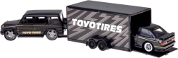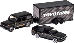 Odkrijte brezčasni dvojec, ki bo navdušil zbiratelje in ljubitelje avtomobilov: robustni Mercedes‑Benz G (1988) in legendarni BMW M3 E30 v enotni črni barvni kombinaciji. Kovinsko ohišje s preciznimi linijami, gumijasta kolesa in čisti tisk detajlov modelom dodajajo avtentičen videz. Funkcionalna prikolica z vstopno rampo omogoča varno “prevoziti” BMW za Mercedesom, kar povečuje igrivost in privlačnost pri razstavljanju.